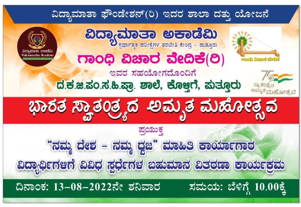 ಪುತ್ತೂರು: ವಿದ್ಯಾಮಾತಾ ಫೌಂಡೇಶನ್(ರಿ) ಇದರ ಶಾಲಾ ದತ್ತು ಯೋಜನೆ, ವಿದ್ಯಾಮಾತಾ ಅಕಾಡೆಮಿ, ಗಾಂಧಿ ವಿಚಾರ ವೇದಿಕೆ(ರಿ) ಇದರ ಸಹಯೋಗದೊಂದಿಗೆ ದಕ್ಷಿಣ ಕನ್ನಡ ಜಿಲ್ಲಾ ಪಂಚಾಯತ್ ಸರಕಾರಿ ಹಿರಿಯ ಪ್ರಾಥಮಿಕ ಶಾಲೆ ಕೊಳ್ತಿಗೆಯಲ್ಲಿ ಭಾರತ ‘ಸ್ವಾತಂತ್ರ್ಯದ ಅಮೃತ ಮಹೋತ್ಸವ’ದ ಪ್ರಯುಕ್ತ ‘ನಮ್ಮ ದೇಶ- ನಮ್ಮ ಧ್ವಜ’ ಮಾಹಿತಿ ಕಾರ್ಯಾಗಾರ ಆ.13 ರಂದು ನಡೆಯಲಿದೆ.