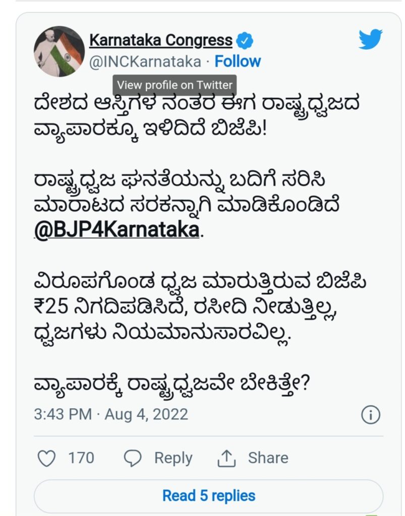 ‘ವ್ಯಾಪಾರಂ ದ್ರೋಹ ಚಿಂತನಂ’ ಎಂಬ ಮಾತಿದೆ, ಅಂತೆಯೇ ವ್ಯಾಪಾರಿ ಪಕ್ಷ ಬಿಜೆಪಿ ಹಣ ಕೊಳ್ಳೆ ಹೊಡೆಯಲು ಕಳಪೆ ಧ್ವಜ ಮಾರಾಟದ ಮೂಲಕ ರಾಷ್ಟ್ರಧ್ವಜಕ್ಕೆ, ದೇಶಕ್ಕೆ ದ್ರೋಹವೆಸಗುತ್ತಿದೆ. ಬಿಜೆಪಿಯ ಹಣದಾಹಕ್ಕೆ ರಾಷ್ಟ್ರಧ್ವಜ ವಿರೂಪವಾಗುತ್ತಿರುವುದು ಸಹಿಸಲಾಗದ ಸಂಗತಿ. ಬಿಜೆಪಿಯ ಪ್ರಚಾರದ ತೆವಲಿಗೆ ಧ್ವಜದ ಘನತೆ ಬಲಿಯಾಗದಿರಲಿ. ದೇಶದ ಆಸ್ತಿಗಳ ನಂತರ ಈಗ ರಾಷ್ಟ್ರಧ್ವಜದ ವ್ಯಾಪಾರಕ್ಕೂ ಇಳಿದಿದೆ ಬಿಜೆಪಿ. ರಾಷ್ಟ್ರಧ್ವಜದ ಘನತೆಯನ್ನು ಬದಿಗೆ ಸರಿಸಿ ಮಾರಾಟದ ಸರಕನ್ನಾಗಿ ಮಾಡಿಕೊಂಡಿದೆ. ವಿರೂಪಗೊಂಡ ಧ್ವಜ ಮಾರುತ್ತಿರುವ ಬಿಜೆಪಿ 25 ರೂ. ನಿಗದಿಪಡಿಸಿದೆ. ರಸೀದಿ ನೀಡುತ್ತಿಲ್ಲ, ಧ್ವಜಗಳು ನಿಯಮಾನುಸಾರವಾಗಿಲ್ಲ. ವ್ಯಾಪಾರಕ್ಕೆ ರಾಷ್ಟ್ರಧ್ವಜವೇ ಬೇಕಿತ್ತೇ..!!?? ಎಂದು ಪ್ರಶ್ನಿಸಿದೆ.