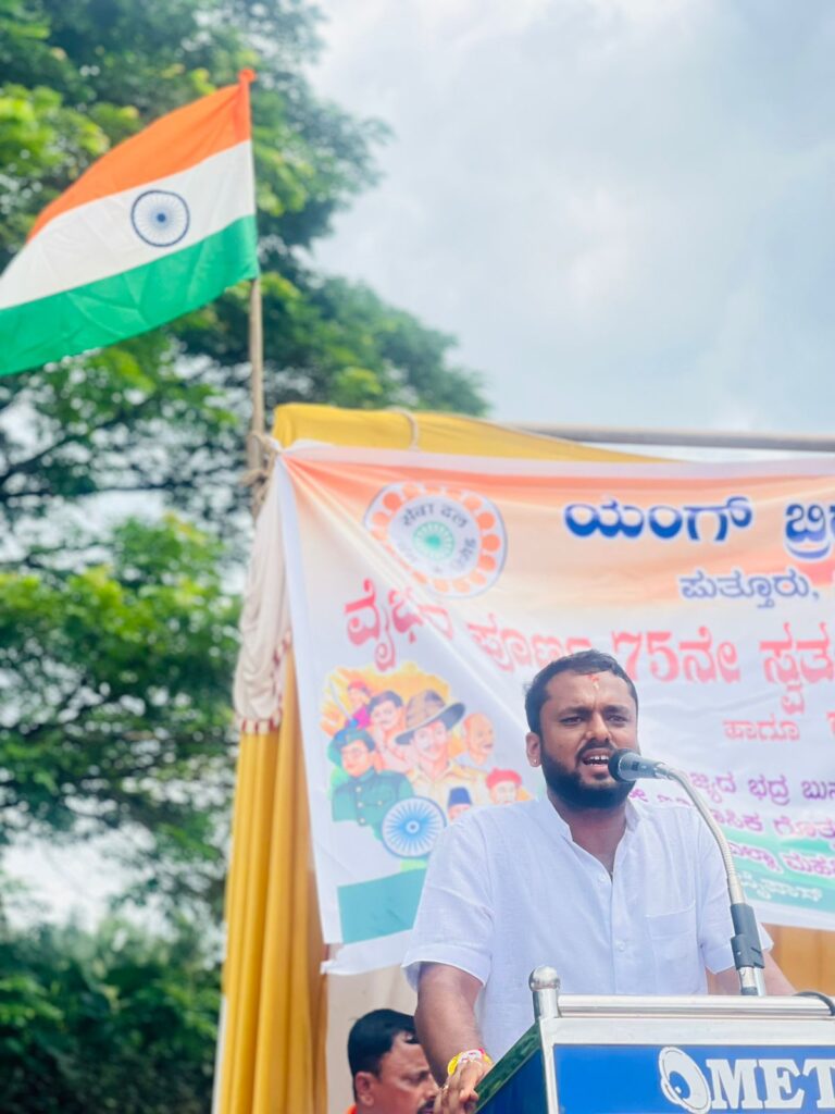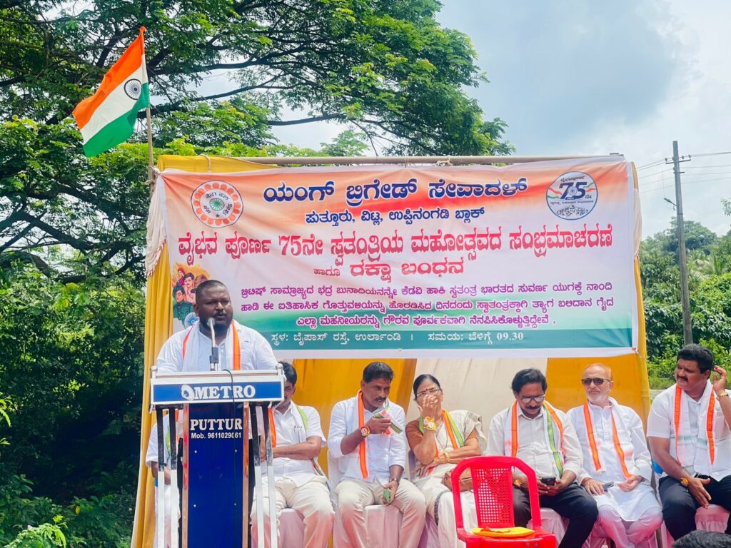 ಪುತ್ತೂರು ಯಂಗ್ ಬ್ರಿಗೇಡ್ ನ ಅಧ್ಯಕ್ಷ ರಂಜಿತ್ ಬಂಗೇರ ರವರು ಧ್ವಜಾರೋಹಣ ಗೈದರು, ಕಾರ್ಯಕ್ರಮದಲ್ಲಿ ಬಾಗವಹಿಸಿದ ಮಾಜಿ ಶಾಸಕಿ ಶಕುಂತಲಾ ಟಿ ಶೆಟ್ಟಿ ಮಾತನಾಡಿ, ನಾವು ಕಲಿತ ಇತಿಹಾಸದಲ್ಲಿ ಸ್ವಾತಂತ್ರ್ಯ ಸಂಗ್ರಾಮದಲ್ಲಿ ಹೋರಾಡಿದ ಹಾಗೂ ಹುತಾತ್ಮರಾದ ಮಹಾನ್ ವ್ಯಕ್ತಿಗಳ ಬಗ್ಗೆ ತಿಳಿದಿದ್ದು, ಆದರೆ ಅಮೃತ ಮಹೋತ್ಸವದ ಈ ಸಂದರ್ಭದಲ್ಲಿ ನೈಜ ಹೋರಾಟಗಾರರ ಹೆಸರನ್ನು ಬಿಟ್ಟು ಯಾರ್ಯಾರದು ಹೆಸರು ಕೇಳಿ ಬರುತ್ತಿದೆ, ಈ ರೀತಿ ಇತಿಹಾಸವನ್ನು ತಿರಿಚುವುದು ದೇಶ ದ್ರೋಹದ ಕೆಲಸವಾಗಿರುತ್ತದೆ, ಸತ್ಯ ಯಾವತ್ತೂ ಸತ್ಯವೇ ಸುಳ್ಳುಗಳಿಗೆ ಹೆಚ್ಚಿನ ಆಯುಷ್ಯವಿಲ್ಲ ಎಂದ ಅವರು ದೇಶದ ಪ್ರಥಮ ಪ್ರಧಾನಿ ಜವಾಹರ್ ಲಾಲ್ ನೆಹರು ಈ ದೇಶದ ಅಭಿವೃದ್ಧಿಗೆ ಹಾಕಿದ ಅಡಿಪಾಯವೇ ಭಾರತ ದೇಶ ಇಷ್ಟು ಅಭಿವೃದ್ಧಿಯಾಗಲು ಕಾರಣವಾಗಿರುತ್ತದೆ. ಯಂಗ್ ಬ್ರಿಗೇಡ್ ಸೇವಾದಳದವರು ಸ್ವಾತಂತ್ರ್ಯ ಸಂಭ್ರಮದೊಂದಿಗೆ ಸಹೋದರತೆಯನ್ನು ಸಾರುವ ರಕ್ಷಾ ಬಂಧನದಂತಹ ಕಾರ್ಯಕ್ರಮ ಹಾಕಿ ಕೊಂಡಿರುವುದು ಶ್ಲಾಘನೀಯ ಎಂದು ಹೇಳಿದರು.