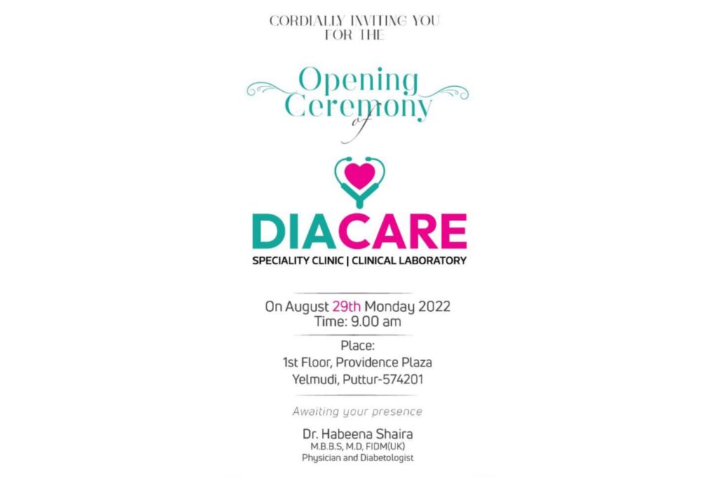 ಪುತ್ತೂರು: ಸ್ಪೆಷಾಲಿಟಿ ಕ್ಲಿನಿಕ್, ಕ್ಲಿನಿಕಲ್ ಲ್ಯಾಬೋರೇಟರಿ ‘DIA CARE’ ಆ.29 ರಂದು ಏಳ್ಮುಡಿಯ ಪ್ರಾವಿಡೆನ್ಸ್ ಪ್ಲಾಜಾದ ಒಂದನೇ ಮಹಡಿಯ ಶುಭಾರಂಭಗೊಳ್ಳಲಿದೆ.
