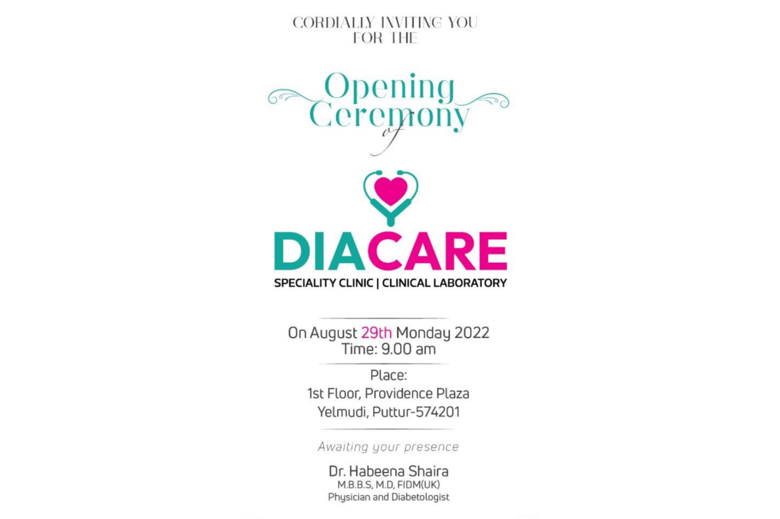 ಪುತ್ತೂರು: ಸ್ಪೆಷಾಲಿಟಿ ಕ್ಲಿನಿಕ್, ಕ್ಲಿನಿಕಲ್ ಲ್ಯಾಬೋರೇಟರಿ ‘DIA CARE’ ಆ.29 ರಂದು ಏಳ್ಮುಡಿಯ ಪ್ರಾವಿಡೆನ್ಸ್ ಪ್ಲಾಜಾದ ಒಂದನೇ ಮಹಡಿಯ ಶುಭಾರಂಭಗೊಳ್ಳಲಿದೆ.