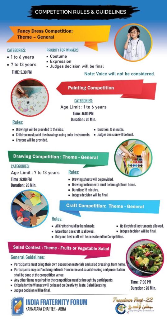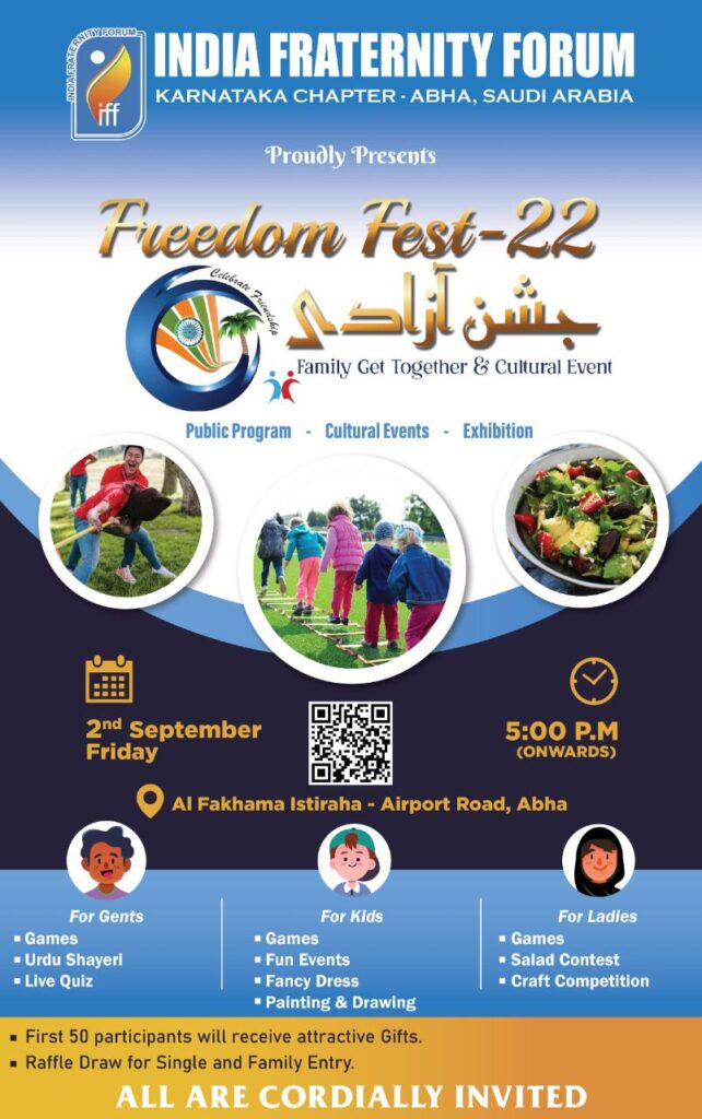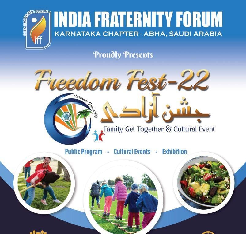 ಇಂಡಿಯಾ ಫ್ರೆಟರ್ನಿಟಿ ಫಾರಂ (ಐ ಎಫ್ ಎಫ್) ಕರ್ನಾಟಕ ಚಾಪ್ಟರ್,ಅಭಾ-ಸೌದಿ ಅರೇಬಿಯಾ ವತಿಯಿಂದ ಸ್ವಾತಂತ್ರ್ಯೋತ್ಸವದ ಅಮೃತ ಮಹೋತ್ಸವದ ಪ್ರಯುಕ್ತ ಕರ್ನಾಟಕ ಹಾಗೂ ಉತ್ತರ ಭಾರತದ ಅನಿವಾಸಿಗರ ಸಮ್ಮಿಲನ “ಫ್ರೀಡಂ ಫೆಸ್ಟ್ (ಜಶ್ನೇ ಆಝಾದಿ)” ಕಾರ್ಯಕ್ರಮವು ಸೆ.02 ರಂದು ಅಭಾ, ಏರ್ಪೋರ್ಟ್ ರೋಡ್ ನಲ್ಲಿರುವ ಅಲ್ ಫಕಾಮ ಇಸ್ತಿರಾಹ್ ನಲ್ಲಿ ನಡೆಯಲಿದೆ.