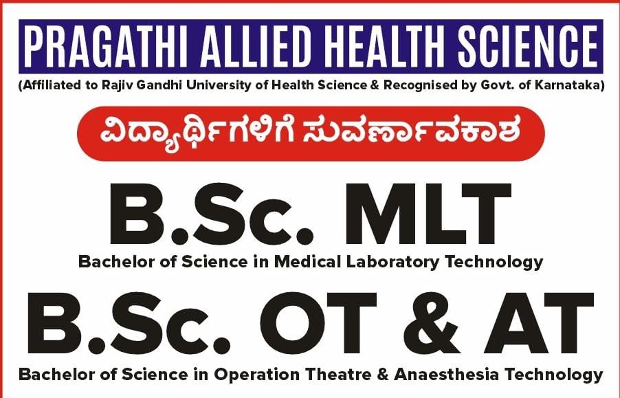 ಪುತ್ತೂರು: ಪ್ರಗತಿ ಅಲೈಡ್ ಹೆಲ್ತ್ ಸೈನ್ಸ್ ನಲ್ಲಿ ಕಾಲೇಜಿನಲ್ಲಿ ದಾಖಲಾತಿ ಆರಂಭವಾಗಿದ್ದು, ಬಿಎಸ್ಸಿ ಎಂಎಲ್ ಟಿ ( Bachelor of science in Medical Laboratory Technology), ಬಿಎಸ್ಸಿ ಒಟಿ & ಎಟಿ ( Bachelor of science in Operation Theatre & Anaesthesia Technology) ಕೋರ್ಸ್ ಗಳಿಗೆ ದಾಖಲಾಗಿದೆ ಆರಂಭವಾಗಿದೆ.