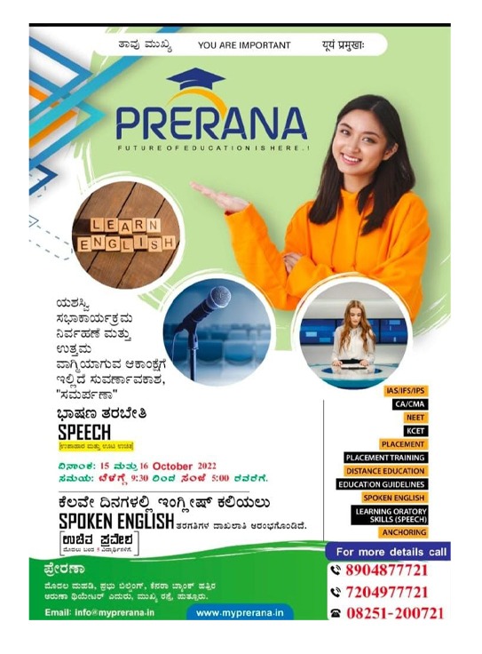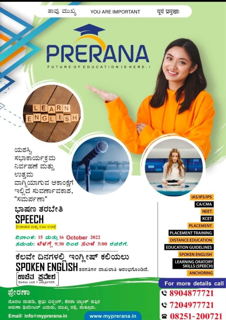 ಪುತ್ತೂರಿನಲ್ಲಿ ಕಾರ್ಯಚರಿಸುತ್ತಿರುವ ವೃತ್ತಿಪರ ಕೋರ್ಸ್ ಗಳ ತರಬೇತಿ ಸಂಸ್ಥೆ ‘ಪ್ರೇರಣಾ’ ದಲ್ಲಿ ‘ಸಮರ್ಪಣಾ ಭಾಷಣ ತರಬೇತಿ’ಯು ಅ.15 ಮತ್ತು 16 ರಂದು ನಡೆಯಲಿದೆ.
