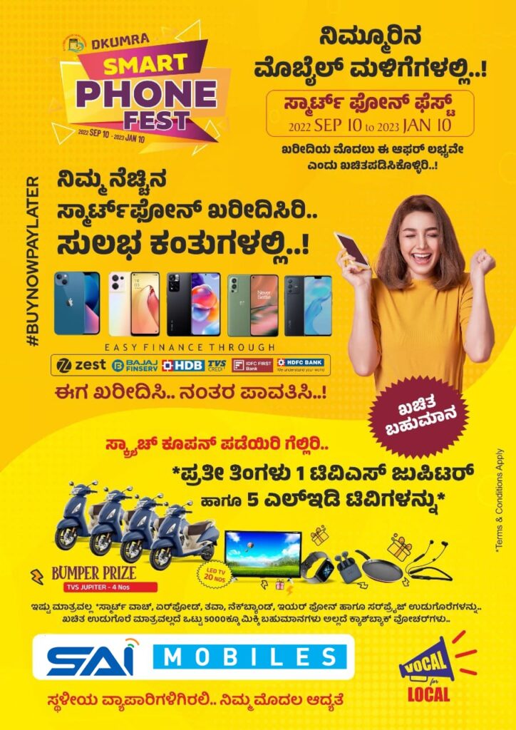 ಪುತ್ತೂರಿನ ಖ್ಯಾತ ಮೊಬೈಲ್ ಮಳಿಗೆ ‘ಸಾಯಿ ಮೊಬೈಲ್ಸ್’ 2022 ಇಂದಿನಿಂದ 2023 ಜ.10ರ ವರೆಗೆ ‘ಸ್ಮಾರ್ಟ್ ಫೋನ್ ಫೆಸ್ಟ್’ ನಡೆಯಲಿದೆ.