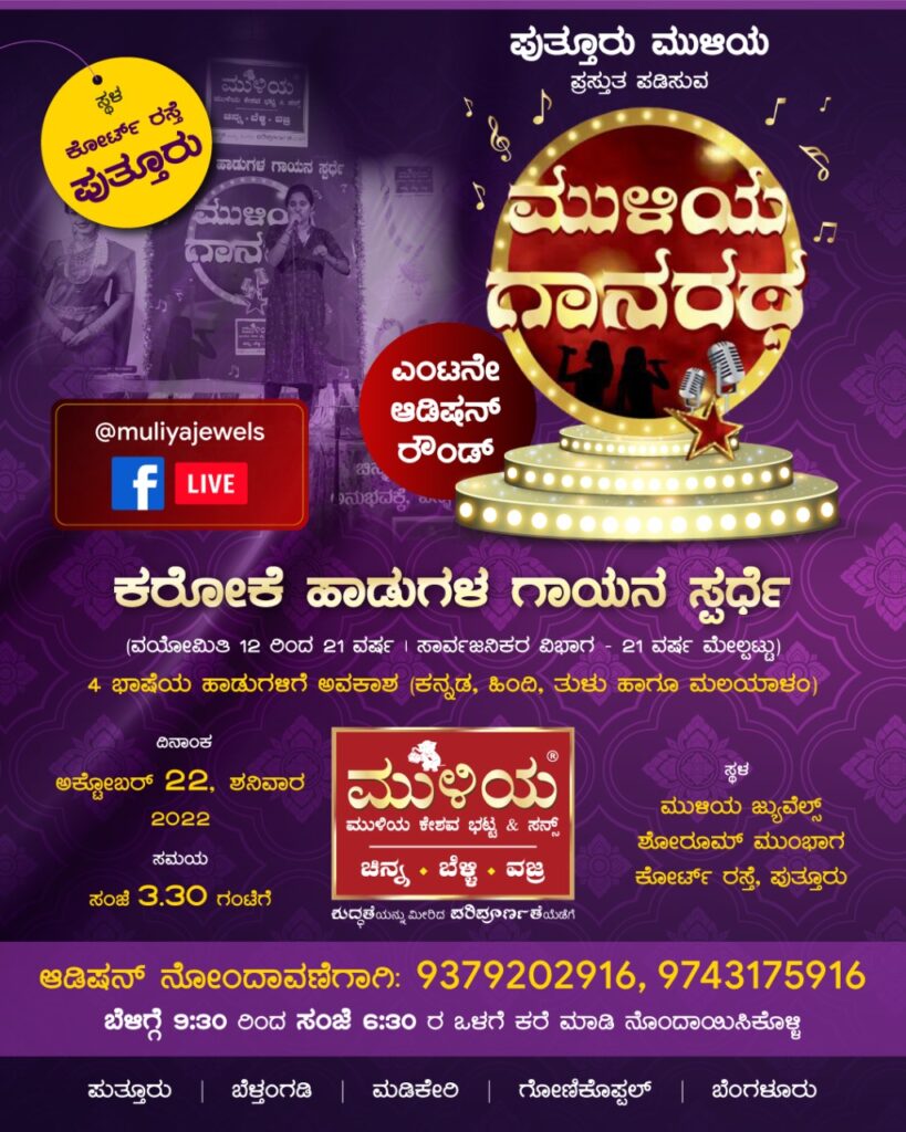 ಪುತ್ತೂರು: ನಾಡಿನ ಹೆಸರಾಂತ ಮುಳಿಯ ಜ್ಯುವೆಲ್ಸ್ ಸಂಸ್ಥೆ ತನ್ನ ಜನಪ್ರಿಯ ಕಾರ್ಯಕ್ರಮವಾದ ಕರೋಕೆ ಹಾಡುಗಳ ಗಾಯನ ಸ್ಪರ್ಧೆ ‘ಮುಳಿಯ ಗಾನರಥ’ದ ಎಂಟನೇ ಆಡಿಷನ್ ರೌಂಡ್ ಅಕ್ಟೋಬರ್ 22ರಂದು ಸಂಜೆ 3:30 ಗಂಟೆಗೆ ಕೋರ್ಟ್ ರಸ್ತೆಯಲ್ಲಿರುವ ಮುಳಿಯ ಜುವೆಲ್ಸ್ ನಲ್ಲಿ ನಡೆಯಲಿದೆ.