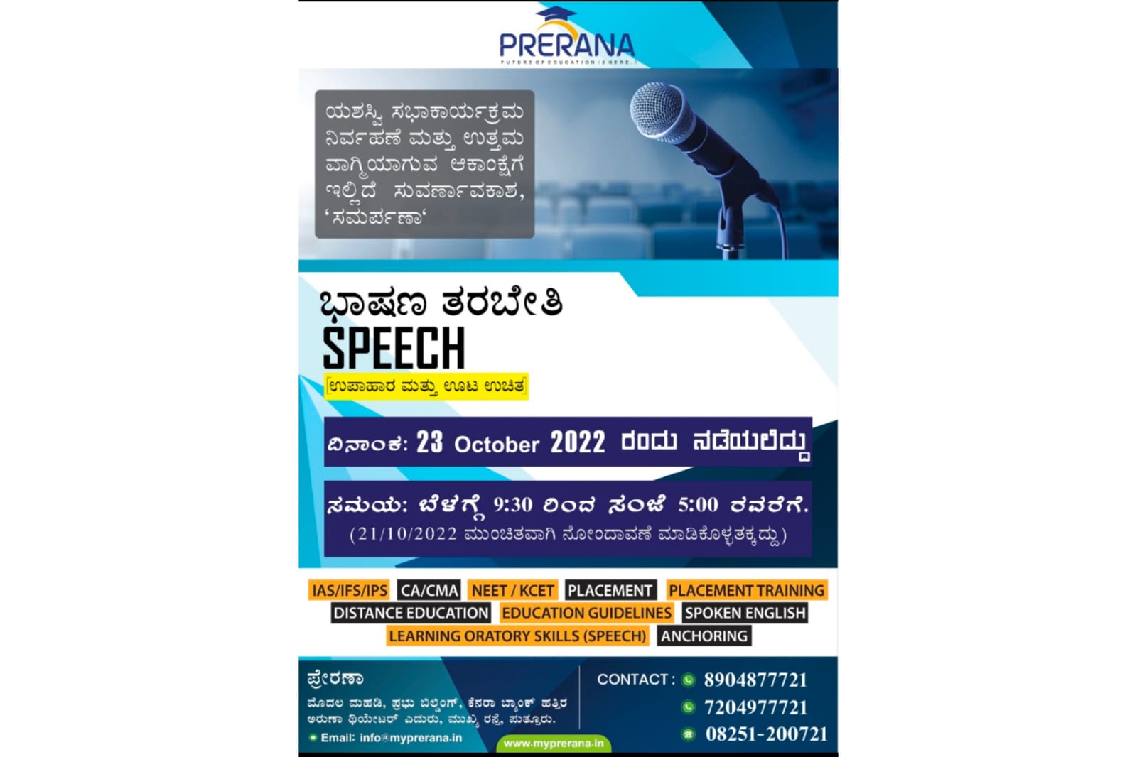 ಯಶಸ್ವಿ ಸಭಾ ಕಾರ್ಯಕ್ರಮ ನಿರ್ವಹಣೆ, ಉತ್ತಮ ವಾಗ್ಮಿಯಾಗುವ ಆಕಾಂಕ್ಷಿಗಳಿಗೆ ತಕ್ಕಂತೆ ‘ಸಮರ್ಪಣಾ’ ಎನ್ನುವ ಭಾಷಣ ತರಬೇತಿ ನಡೆಯಲಿದ್ದು, ಆಸಕ್ತರು ನೋಂದಾವಣೆ ಮಾಡುವಂತೆ ಸಂಸ್ಥೆಯ ಪ್ರಕಟಣೆ ತಿಳಿಸಿದೆ.