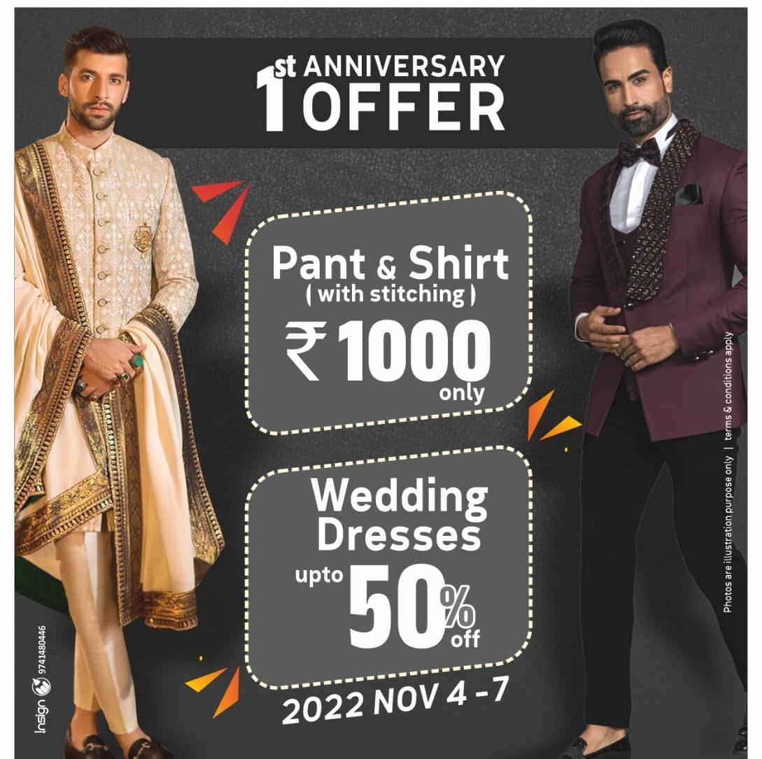 ಪ್ಯಾಂಟ್ & ಶರ್ಟ್ (with stitching ) 1000 ಹಾಗೂ ಮದುವೆ ಬಟ್ಟೆಗಳ ಮೇಲೆ 50% ಡಿಸ್ಕೌಂಟ್ ನೀಡಲಾಗಿದೆ. ಈ ವಿಶೇಷ ಆಫರ್ ನ.4 ರಿಂದ 7ರ ವರೆಗೆ ಗ್ರಾಹಕರಿಗೆ ಲಭ್ಯವಿದೆ ಮಳಿಗೆಯ ಮಾಲಕರು ಪ್ರಕಟಣೆಯಲ್ಲಿ ತಿಳಿಸಿದ್ದಾರೆ..