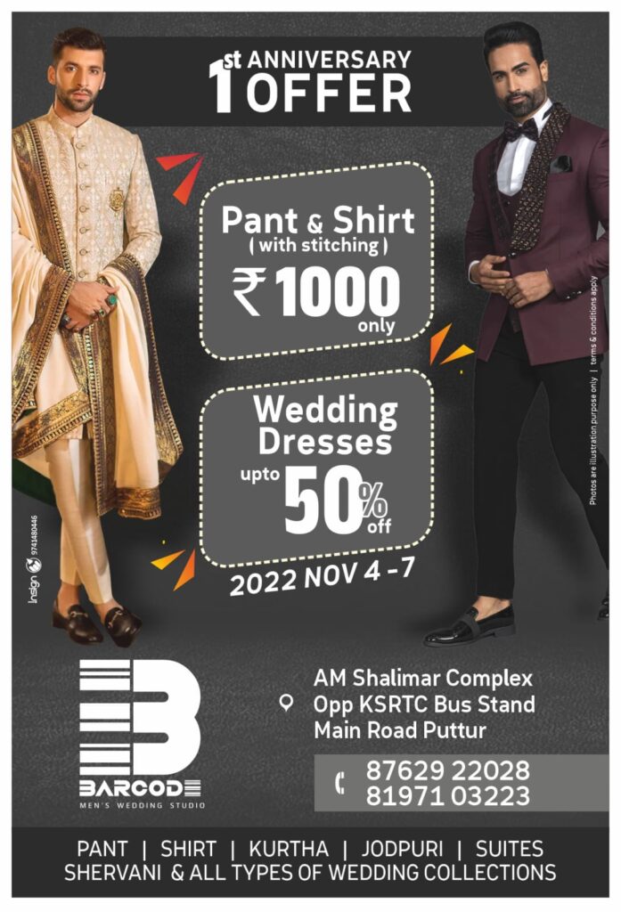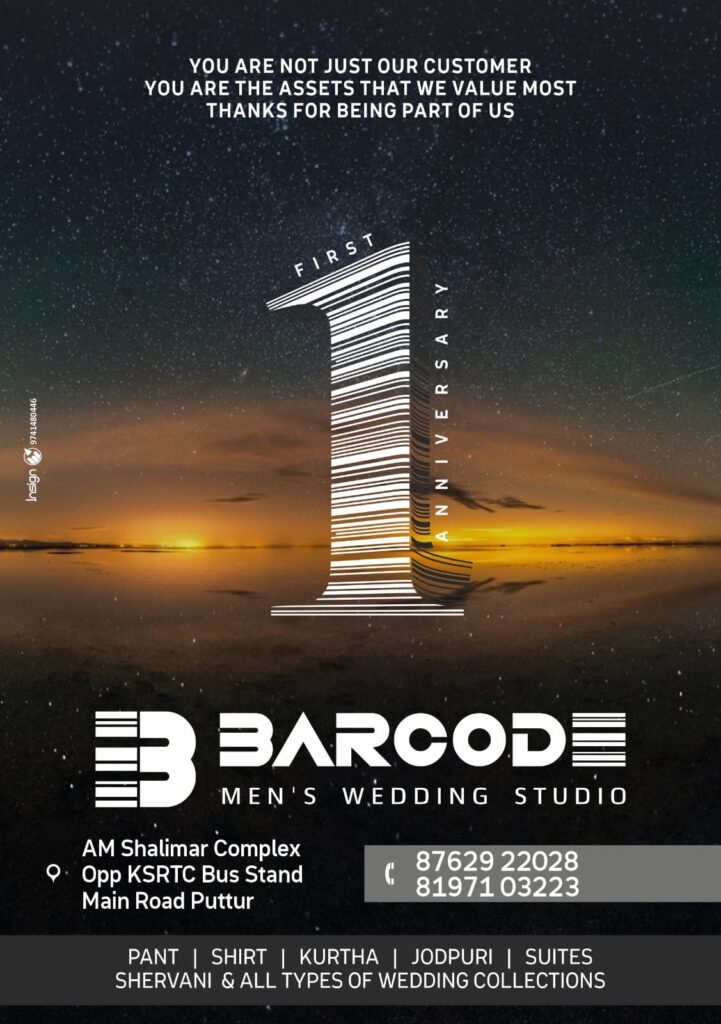 ಪುತ್ತೂರು: ಪುರುಷರ ಸಿದ್ಧ ಹಾಗೂ ಮದುವೆ ಉಡುಪುಗಳ ಮಳಿಗೆ ‘ಬಾರ್ ಕೋಡ್’ ಮೆನ್ಸ್ ವೆಡ್ಡಿಂಗ್ ಸ್ಟುಡಿಯೊ ಒಂದನೇ ವರ್ಷಕ್ಕೆ ಪಾದಾರ್ಪಣೆಗೈದಿದ್ದು, ಈ ಹಿನ್ನೆಲೆ ಗ್ರಾಹಕರಿಗೆ ವಿಶೇಷ ಆಫರ್ ನೀಡುತ್ತಿದೆ.