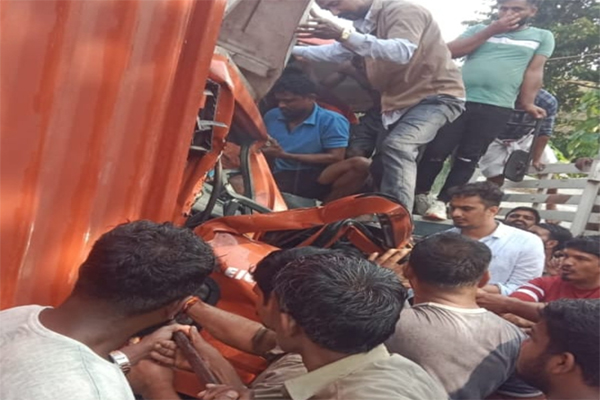 ಬಸ್-ಲಾರಿ ನಡುವೆ ಸಿಕ್ಕಿ ಹಾಕಿಕೊಂಡ ಲಾರಿ ಚಾಲಕನನ್ನು ಹೊರಗೆಳೆಯಲು ಸ್ಥಳೀಯರು ರಾಡ್ನ್ನೇ ಕತ್ತರಿಸಬೇಕಾದ ಘಟನೆ ನಡೆಯಿತು.