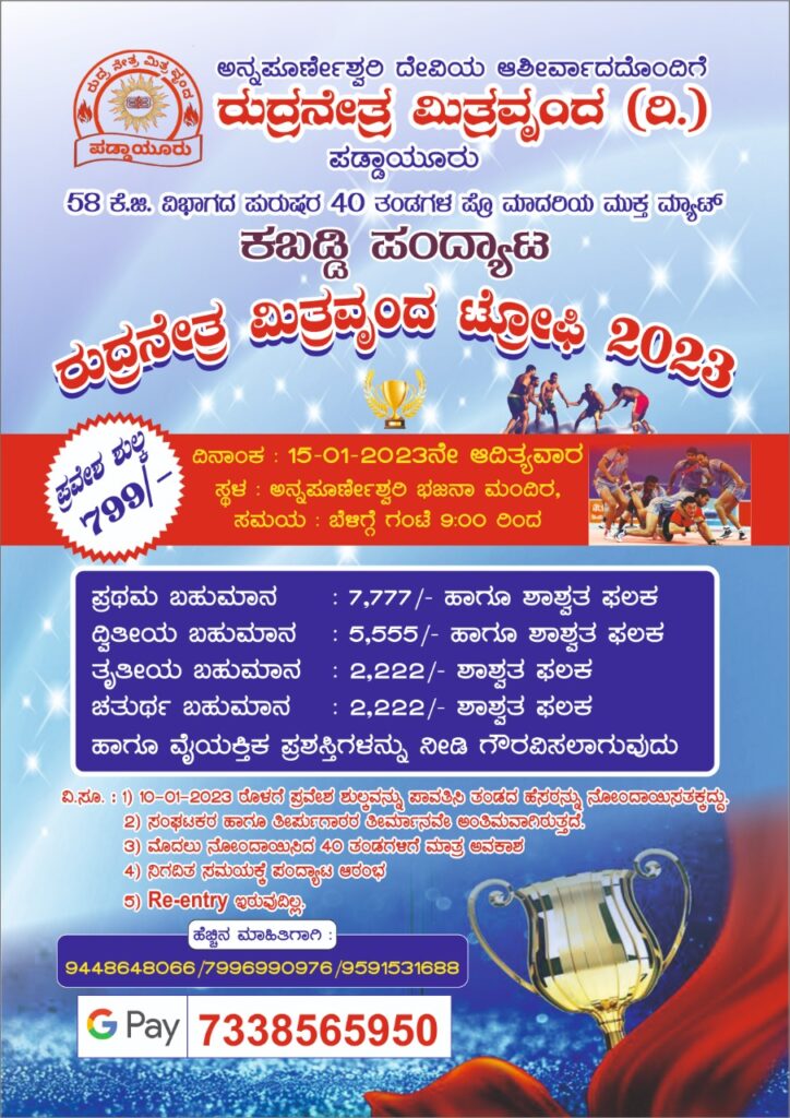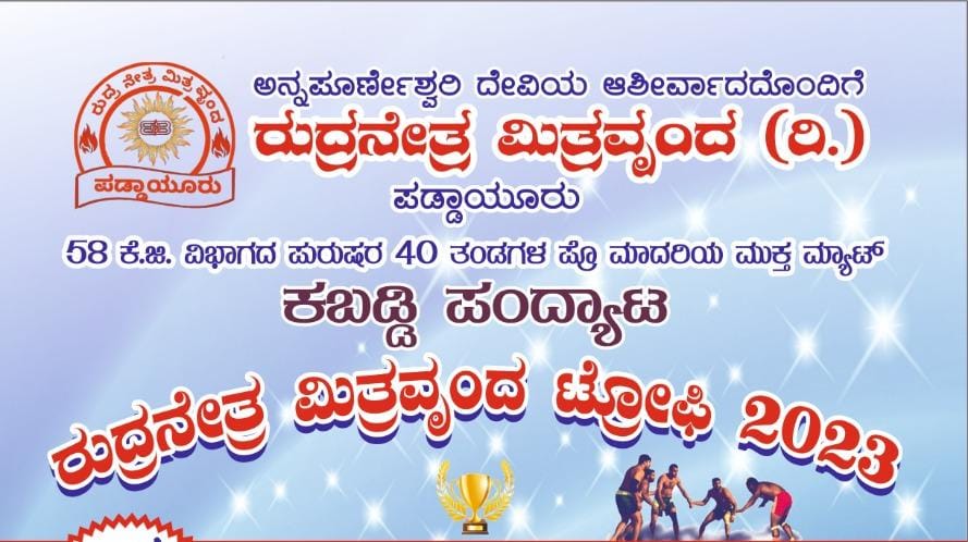 ಪುತ್ತೂರು: ರುದ್ರನೇತ್ರ ಮಿತ್ರವೃಂದ ರಿ. ಪಡ್ದಾಯೂರು ವತಿಯಿಂದ 58 ಕೆ.ಜಿ. ವಿಭಾಗದ ಪುರುಷರ 40 ತಂಡಗಳ ಪ್ರೊ ಮಾದರಿಯ ಮುಕ್ತ ಮ್ಯಾಟ್ ಕಬಡ್ಡಿ ಪಂದ್ಯಾಟ ‘ರುದ್ರನೇತ್ರ ಮಿತ್ರವೃಂದ ಟ್ರೋಫಿ-2023’ ಜ.15 ರಂದು ಅನ್ನಪೂರ್ಣೇಶ್ವರಿ ಭಜನಾ ಮಂದಿರದಲ್ಲಿ ನಡೆಯಲಿದೆ.