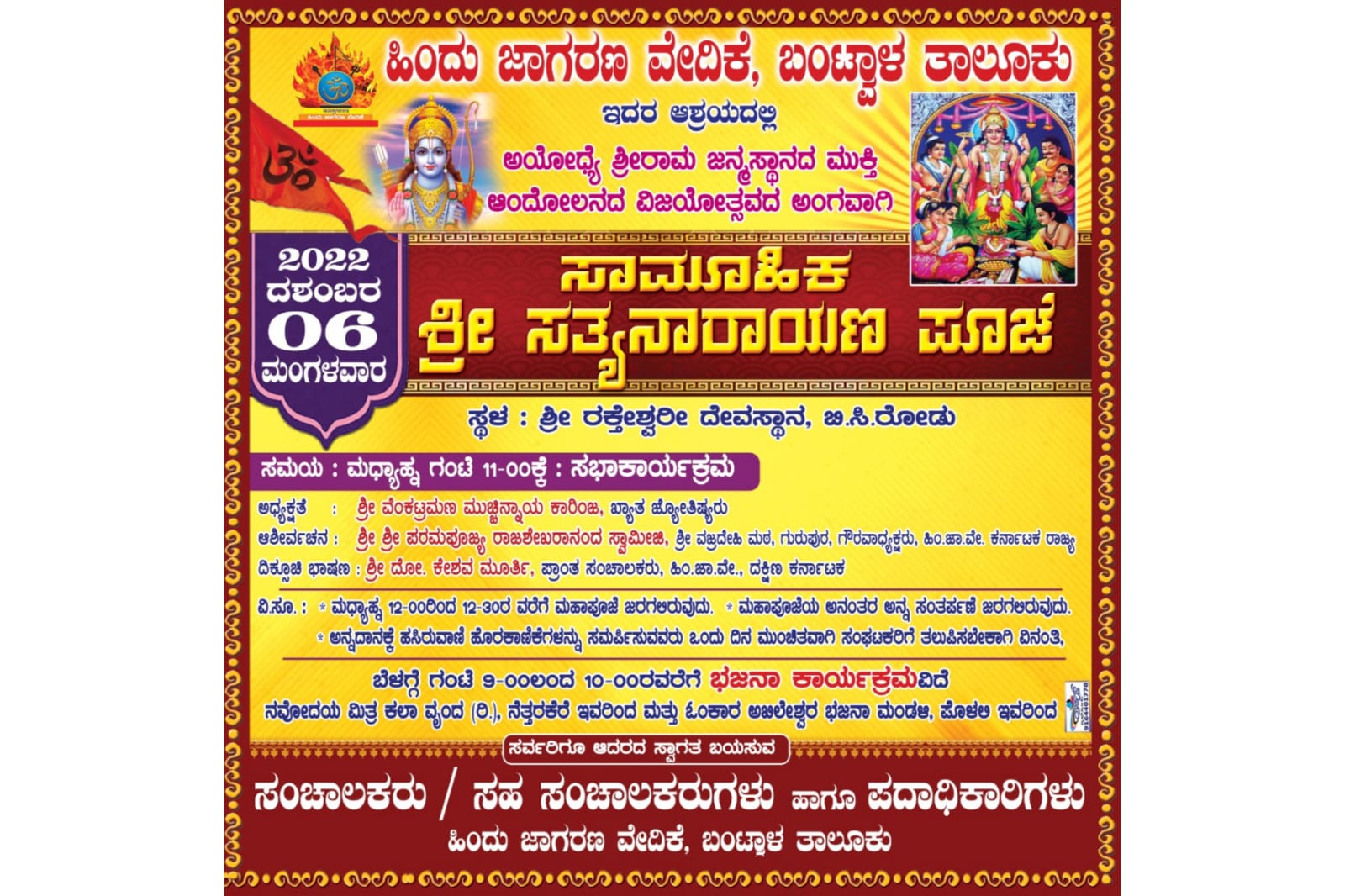 ಬಂಟ್ವಾಳ: ಹಿಂದೂ ಜಾಗರಣ ವೇದಿಕೆ ಬಂಟ್ವಾಳ ತಾಲೂಕು ಇದರ ಆಶ್ರಯದಲ್ಲಿ ಅಯೋಧ್ಯೆ ಶ್ರೀರಾಮ ಜನ್ಮಸ್ಥಾನದ ಮುಕ್ತಿ ಆಂದೋಲನದ ವಿಜಯೋತ್ಸವದ ಅಂಗವಾಗಿ ಸಾಮೂಹಿಕ ‘ಶ್ರೀ ಸತ್ಯ ನಾರಾಯಣ ಪೂಜೆ’ ಡಿ.6 ರಂದು ಬಿ.ಸಿ.ರೋಡು ಶ್ರೀ ರಕ್ತೇಶ್ವರಿ ದೇವಸ್ಥಾನದಲ್ಲಿ ನಡೆಯಲಿದೆ.