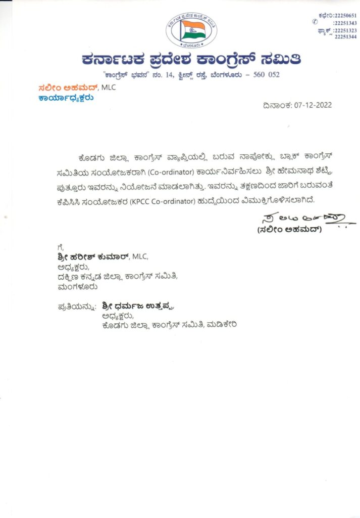 ಕೊಡಗು ಜಿಲ್ಲಾ ಕಾಂಗ್ರೆಸ್ ವ್ಯಾಪ್ತಿಯಲ್ಲಿ ಬರುವ ನಾಪೋಕ್ಲು ಬ್ಲಾಕ್ ಕಾಂಗ್ರೆಸ್ ಸಮಿತಿಯ ಸಂಯೋಜಕರಾಗಿ ಕಾರ್ಯನಿರ್ವಹಿಸಲು ಕಾವು ಹೇಮಾನಾಥ್ ಶೆಟ್ಟಿ ರವರನ್ನು ನೇಮಕ ಮಾಡಲಾಗಿತ್ತು. ಆದರೇ ಇದೀಗ ಕರ್ನಾಟಕ ಪ್ರದೇಶ ಕಾಂಗ್ರೆಸ್ ಸಮಿತಿ ಕಾರ್ಯಾಧ್ಯಕ್ಷ ಸಲೀಂ ಅಹಮದ್ ಈ ಹುದ್ದೆಯಿಂದ ಹೇಮನಾಥ್ ಶೆಟ್ಟಿ ರನ್ನು ವಿಮುಕ್ತಿಗೊಳಿಸಿ ಆದೇಶಿಸಿದ್ದಾರೆ.