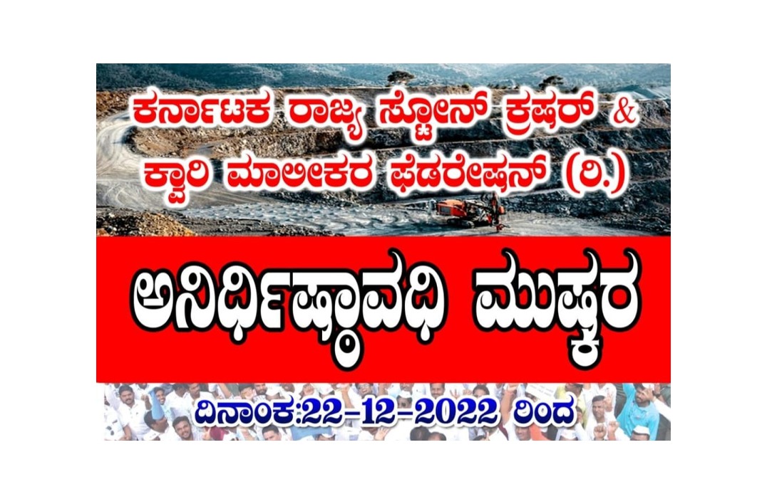ಸರ್ಕಾರ ಸಮಸ್ಯೆಗಳನ್ನು ಪರಿಹರಿಸದ ಹಿನ್ನೆಲೆ ಫೆಡರೇಷನ್ ಆಫ್ ಕರ್ನಾಟಕ ಕ್ವಾರಿ ಮತ್ತು ಸ್ಟೋನ್ ಕ್ರಷರ್ ಓನರ್ಸ್ ಅಸೋಸಿಯೇಷನ್ ರಿ. ವತಿಯಿಂದ ಜಲ್ಲಿ ಕಲ್ಲುಗಳನ್ನು ಪೂರೈಕೆ ಮಾಡದೆ ಪ್ರತಿಭಟನೆ ನಡೆಸುವ ಬಗ್ಗೆ ಮಾಹಿತಿ ಲಭ್ಯವಾಗಿದೆ.