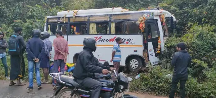 ಬೆಳ್ತಂಗಡಿ: ಬಳ್ಳಾರಿಯಿಂದ ಶಬರಿಮಲೆಗೆ ಹೊರಟ ಮಿನಿ ಬಸ್ ಮುಂಡಾಜೆಯ ಉಳ್ಳಾಲ್ತಿ ಕಟ್ಟೆ ಎಂಬಲ್ಲಿ ಬ್ರೇಕ್ ಫೇಲ್ ಆಗಿ ಬಸ್ ರಸ್ತೆ ಬದಿಯ ಅರಣ್ಯಕ್ಕೆ ನುಗ್ಗಿದ ಪರಿಣಾಮ ಹಲವರಿಗೆ ಗಾಯವಾದ ಘಟನೆ ಡಿ.23ರ ಮುಂಜಾನೆ ನಡೆದಿದೆ.
