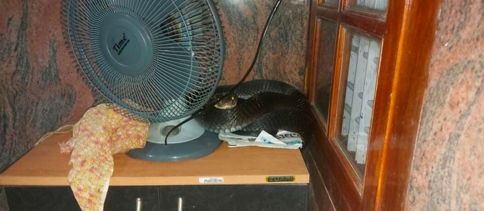 ಹತ್ಯಡ್ಕ ನಿವಾಸಿಯಾಗಿರುವ ಉಮೇಶ್ ಎಂಬವರ ಮನೆಯ ರೂಂ ನ ಟೇಬಲ್ ಫ್ಯಾನ್ ಪಕ್ಕದಲ್ಲಿ ಸುಮಾರು 10 ಅಡಿ ಉದ್ದದ ಕಾಳಿಂಗ ಸರ್ಪವೊಂದು ಮಲಗಿರುವುದನ್ನು ಗಮನಿಸಿದ ಮನೆಯ ಸದಸ್ಯರು ಕ್ಷಣ ಕಾಲ ಗಾಬರಿಗೊಂಡು, ಸ್ಥಳೀಯ ಉರಗ ತಜ್ಞರಾದ ಸ್ನೇಕ್ ಅಶೋಕ್ ಲಾಯಿಲ ರವರಿಗೆ ಮಾಹಿತಿ ನೀಡಿದ್ದಾರೆ.
