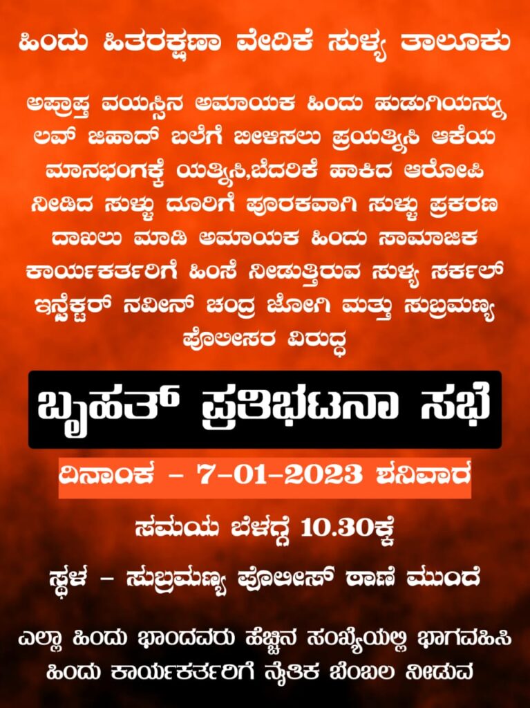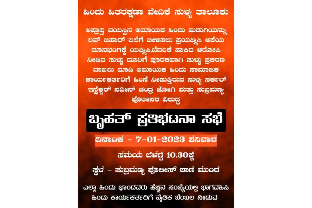 ಪೊಲೀಸರು ತಾರತಮ್ಯ ಮಾಡುತ್ತಿದ್ದಾರೆ, ದೇವಸ್ಥಾನದಂತ ಪವಿತ್ರ ಕ್ಷೇತ್ರದಲ್ಲಿ ಮಾರುವೇಷದಲ್ಲಿ ಬಂದು ಅಕ್ರಮ ಚಟುವಟಿಕೆಯಲ್ಲಿ ತೊಡಗುತ್ತಿದ್ದಾರೆ , ಆದರೂ ಪೊಲೀಸ್ ಇಲಾಖೆ ಇದನ್ನು ಹತ್ತಿಕ್ಕಲು ವಿಫಲವಾಗಿದೆ ಎಂದು ಇಲಾಖೆಯ ವಿರುದ್ದ ಆರೋಪಿಸಿ ಜ.7 ರಂದು (ಇಂದು) ಬೆಳಿಗ್ಗೆ 10.30 ಕ್ಕೆ ಪ್ರತಿಭಟನೆಗೆ ಹಿಂದೂ ಸಂಘಟನೆ ಮುಂದಾಗಿದೆ ಎಂದು ತಿಳಿದು ಬಂದಿದೆ.