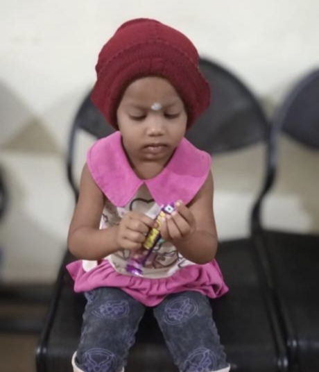ಮಗು ಬೋಳು ತಲೆಯಲ್ಲಿದ್ದು, ಗುಲಾಬಿ ಬಣ್ಣದ ಅಂಗಿ ಧರಿಸಿದೆ.