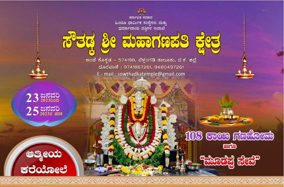 ಬೆಳ್ತಂಗಡಿ: ಸೌತಡ್ಕ ಶ್ರೀ ಮಹಾಗಣಪತಿ ಕ್ಷೇತ್ರದಲ್ಲಿ 108 ಕಾಯಿ ಗಣಹೋಮ ಹಾಗೂ ಮೂಡಪ್ಪ ಸೇವೆ ಜ.23 ರಿಂದ 25ರ ವರೆಗೆ ನಡೆಯಲಿದೆ.