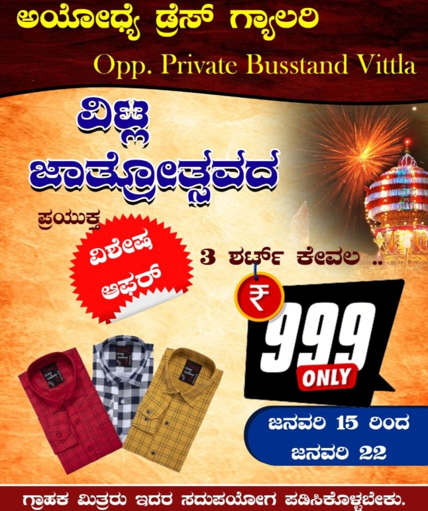 ವಿಟ್ಲ ಜಾತ್ರೋತ್ಸವದ ಪ್ರಯುಕ್ತ ಪ್ರಸಿದ್ಧ ಬಟ್ಟೆಗಳ ಮಳಿಗೆ ‘ಅಯೋಧ್ಯೆ ಡ್ರೆಸ್ ಗ್ಯಾಲರಿ’ಯಲ್ಲಿ ಗ್ರಾಹಕರಿಗಾಗಿ ವಿಶೇಷ ಆಫರ್ ನೀಡಲಾಗಿದೆ.