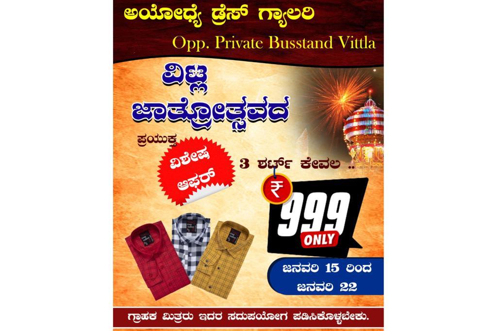 ವಿಟ್ಲ ಜಾತ್ರೋತ್ಸವದ ಪ್ರಯುಕ್ತ ಪ್ರಸಿದ್ಧ ಬಟ್ಟೆಗಳ ಮಳಿಗೆ ‘ಅಯೋಧ್ಯೆ ಡ್ರೆಸ್ ಗ್ಯಾಲರಿ’ಯಲ್ಲಿ ಗ್ರಾಹಕರಿಗಾಗಿ ವಿಶೇಷ ಆಫರ್ ನೀಡಲಾಗಿದೆ.