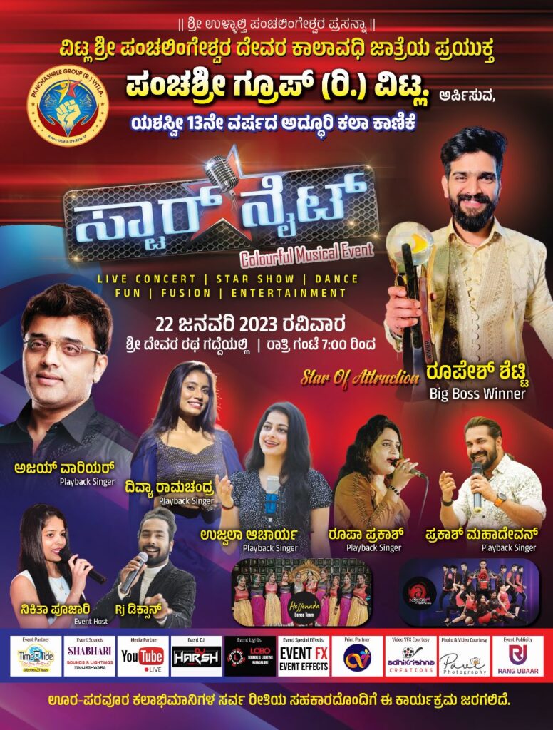 ವಿಟ್ಲ: ಶ್ರೀ ಪಂಚಲಿಂಗೇಶ್ವರ ದೇವರ ಕಾಲಾವಧಿ ಜಾತ್ರೆಯ ಪ್ರಯುಕ್ತ ಪಂಚಶ್ರೀ ಗ್ರೂಪ್(ರಿ.) ರವರ ಯಶಸ್ವಿ 13ನೇ ವರ್ಷದ ಕಲಾ ಕಾಣಿಕೆ ‘ಸ್ಟಾರ್ ನೈಟ್’ ಕಲರ್ ಫುಲ್ ಮ್ಯೂಸಿಕಲ್ ಇವೆಂಟ್ ಕಾರ್ಯಕ್ರಮವು ಜ.22 ರಂದು ಸಂಜೆ 7 ಗಂಟೆಗೆ ಶ್ರೀ ದೇವರ ಜಾತ್ರಾ ಗದ್ದೆಯಲ್ಲಿ ನಡೆಯಲಿದೆ.