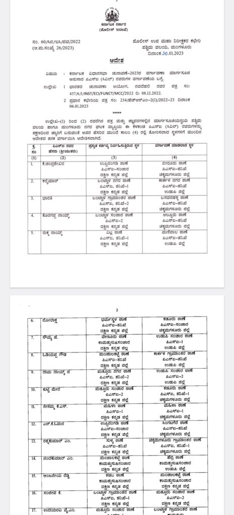 ಕರ್ನಾಟಕ ವಿಧಾನ ಸಭಾ ಚುನಾವಣೆ-2023ರ ವರ್ಗಾವಣಾ ಮಾರ್ಗಸೂಚಿ ಅನುಸಾರ ಪಶ್ಚಿಮ ವಲಯ ಹಾಗೂ ಮಂಗಳೂರು ಘಟಕ ವ್ಯಾಪ್ತಿಯ ಪಿಎಸ್ಐ ಗಳನ್ನು ವರ್ಗಾವಣೆಗೊಳಿಸಿ ಆದೇಶಿಸಲಾಗಿದೆ.