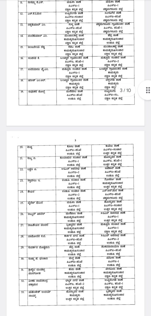 ಪುತ್ತೂರು, ಬಂಟ್ವಾಳ, ವಿಟ್ಲ, ಧರ್ಮಸ್ಥಳ, ಸೇರಿದಂತೆ ದಕ್ಷಿಣ ಕನ್ನಡ ಜಿಲ್ಲೆಯ ಹಲವು ಕಡೆಗಳಲ್ಲಿ ಕಾರ್ಯ ನಿರ್ವಹಿಸುತ್ತಿರುವ ಪೊಲೀಸ್ ಅಧಿಕಾರಿಗಳನ್ನು ವರ್ಗಾವಣೆಗೊಳಿಸಲಾಗಿದೆ.
