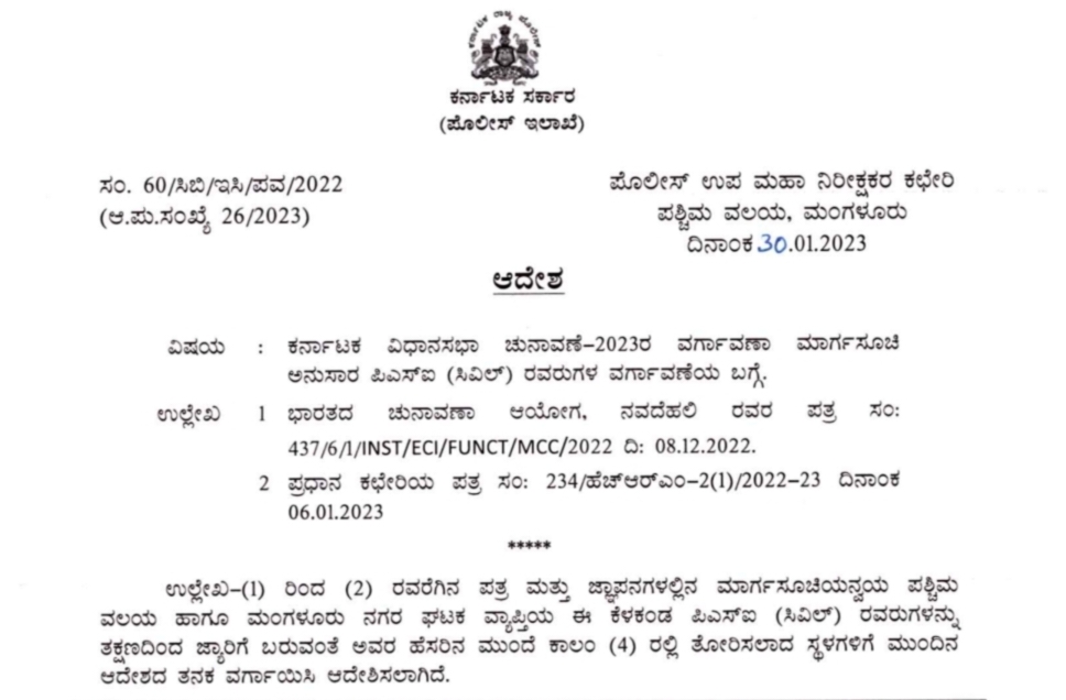 ಕರ್ನಾಟಕ ವಿಧಾನ ಸಭಾ ಚುನಾವಣೆ-2023ರ ವರ್ಗಾವಣಾ ಮಾರ್ಗಸೂಚಿ ಅನುಸಾರ ಪಶ್ಚಿಮ ವಲಯ ಹಾಗೂ ಮಂಗಳೂರು ಘಟಕ ವ್ಯಾಪ್ತಿಯ ಪಿಎಸ್ಐ ಗಳನ್ನು ವರ್ಗಾವಣೆಗೊಳಿಸಿ ಆದೇಶಿಸಲಾಗಿದೆ.