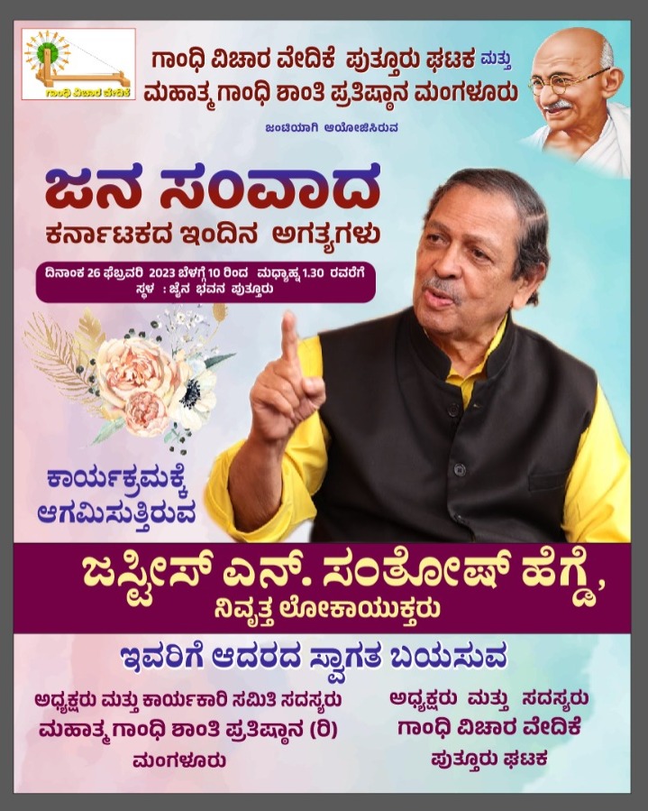 ಪುತ್ತೂರು: ಗಾಂಧಿ ವಿಚಾರ ವೇದಿಕೆ ಪುತ್ತೂರು ಘಟಕ ಮತ್ತು ಮಹಾತ್ಮ ಗಾಂಧಿ ಶಾಂತಿ ಪ್ರತಿಷ್ಠಾನ ಮಂಗಳೂರು ಇದರ ಜಂಟಿ ಆಶ್ರಯದಲ್ಲಿ ‘ಜನ ಸಂವಾದ’ ಕರ್ನಾಟಕದ ಇಂದಿನ ಅಗತ್ಯಗಳು ಕಾರ್ಯಕ್ರಮ ಫೆ.26 ರಂದು ಪುತ್ತೂರಿನ ಜೈನ ಭವನದಲ್ಲಿ ನಡೆಯಲಿದೆ.