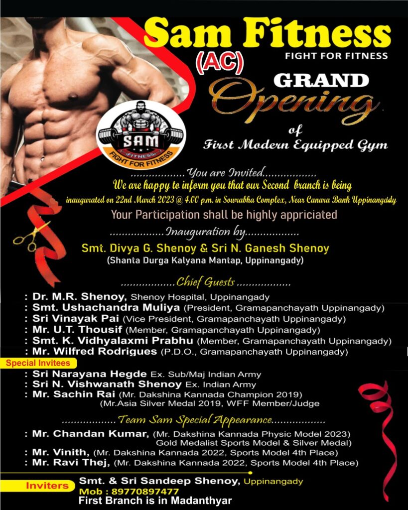 ಉಪ್ಪಿನಂಗಡಿ : ‘Sam Fitness’ ಜಿಮ್ ಮಾ.22 ರಂದು ಉಪ್ಪಿನಂಗಡಿಯ ಸೌರಭ ಕಾಂಪ್ಲೆಕ್ಸ್ ಶುಭಾರಂಭಗೊಳ್ಳಲಿದೆ.