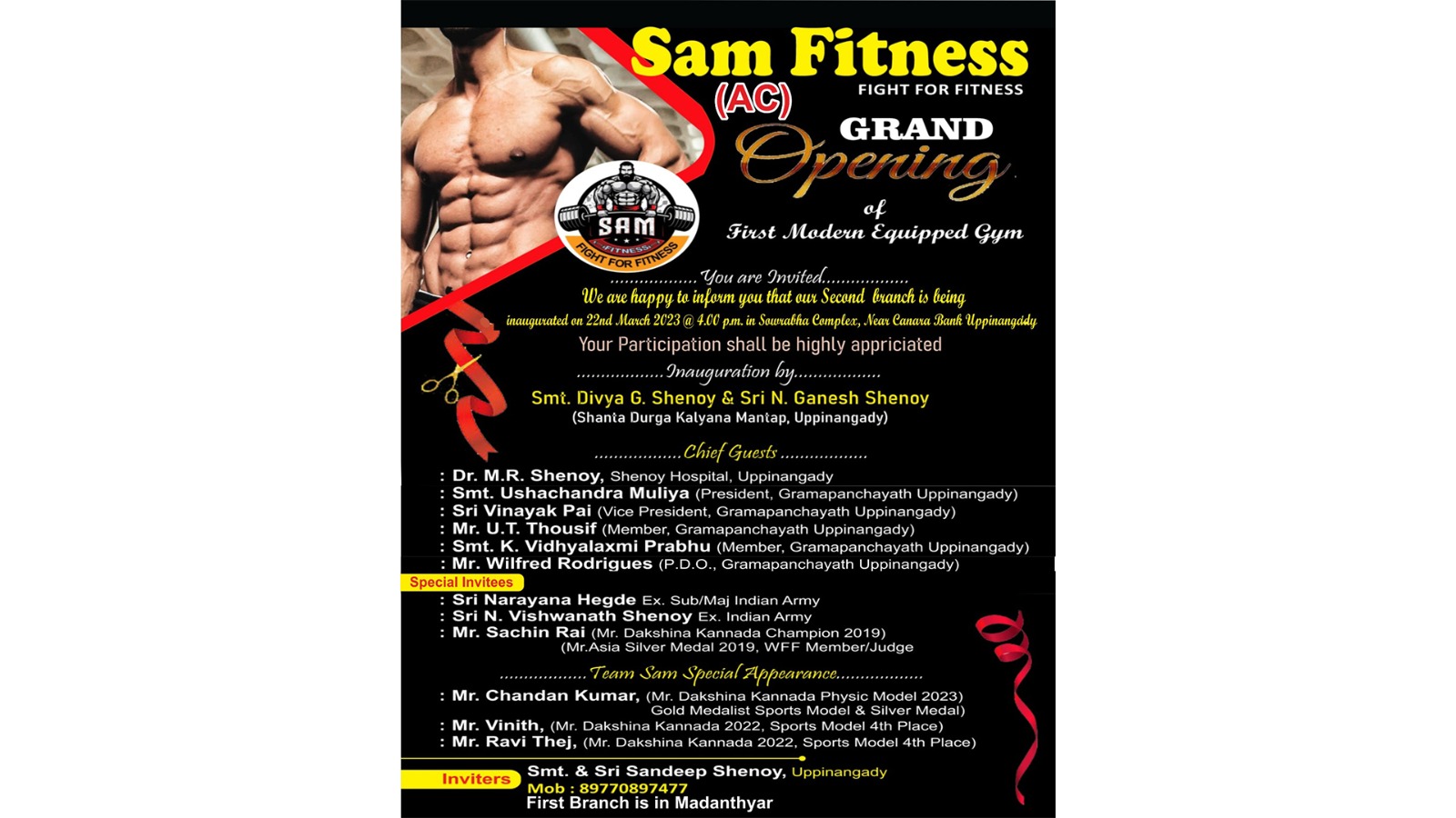 ಉಪ್ಪಿನಂಗಡಿ : ‘Sam Fitness’ ಜಿಮ್ ಮಾ.22 ರಂದು ಉಪ್ಪಿನಂಗಡಿಯ ಸೌರಭ ಕಾಂಪ್ಲೆಕ್ಸ್ ಶುಭಾರಂಭಗೊಳ್ಳಲಿದೆ.