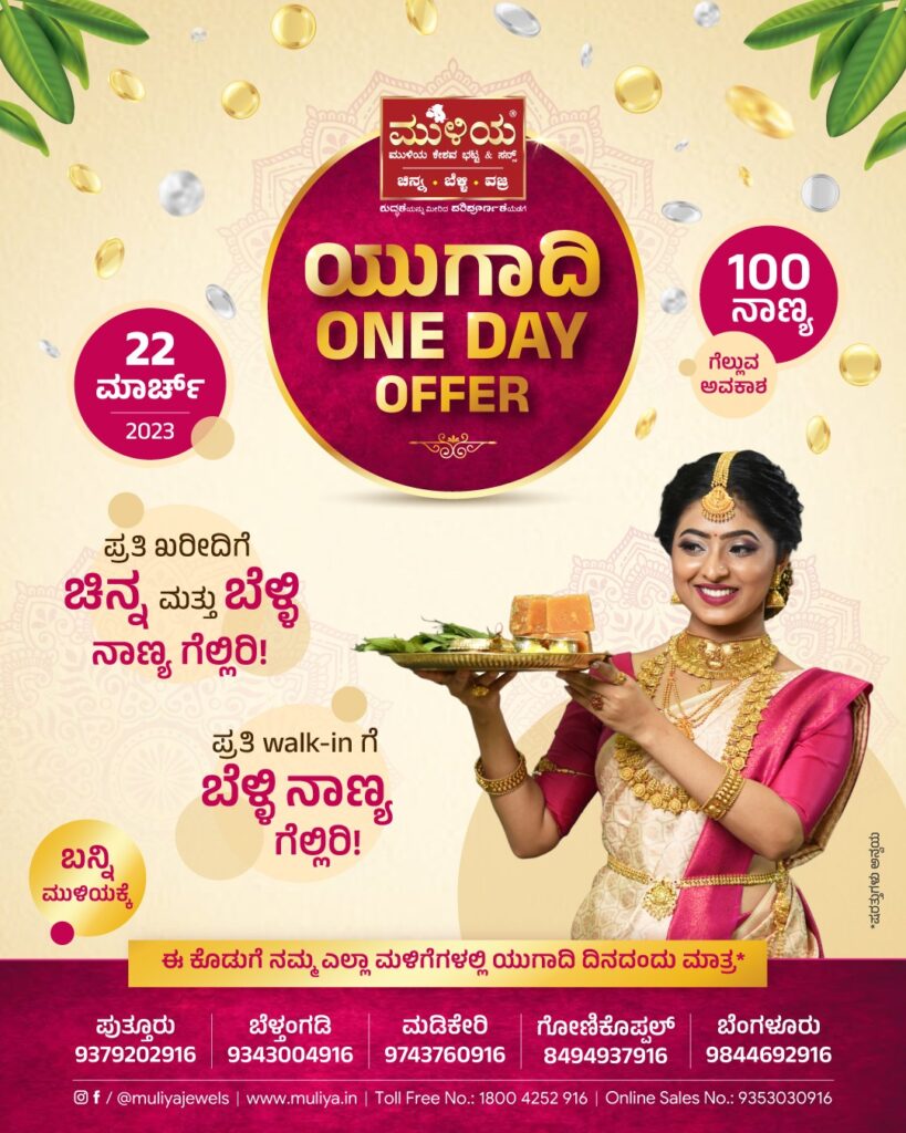ಪುತ್ತೂರು: ರಾಜ್ಯದ ಹೆಸರಾಂತ ಚಿನ್ನಾಭರಣಗಳ ಮಳಿಗೆ ಮುಳಿಯ ಜ್ಯುವೆಲ್ಸ್ ಸಂಸ್ಥೆ ಯುಗಾದಿ ಹಬ್ಬದ ಪ್ರಯುಕ್ತ ತನ್ನ ಎಲ್ಲ ಶೋರೂಂಗಳಲ್ಲಿ ಮಾರ್ಚ್ 22ರಂದು ಯುಗಾದಿ ಒನ್ ಡೇ ವಿಶೇಷ ಆಫರ್ ನೀಡಲಾಗುತ್ತಿದೆ. ಪ್ರತಿ ಖರೀದಿಗೆ ಚಿನ್ನ ಮತ್ತು ಬೆಳ್ಳಿಯ ನಾಣ್ಯಗಳನ್ನು ಗೆಲ್ಲುವ ಸುವರ್ಣಾವಕಾಶವನ್ನು ಗ್ರಾಹಕರಿಗೆ ಒದಗಿಸಲಾಗುತ್ತಿದೆ ಎಂದು ಮುಳಿಯ ಜ್ಯುವೆಲ್ಸ್ ಸಂಸ್ಥೆಯ ಪ್ರಕಟಣೆ ತಿಳಿಸಿದೆ.