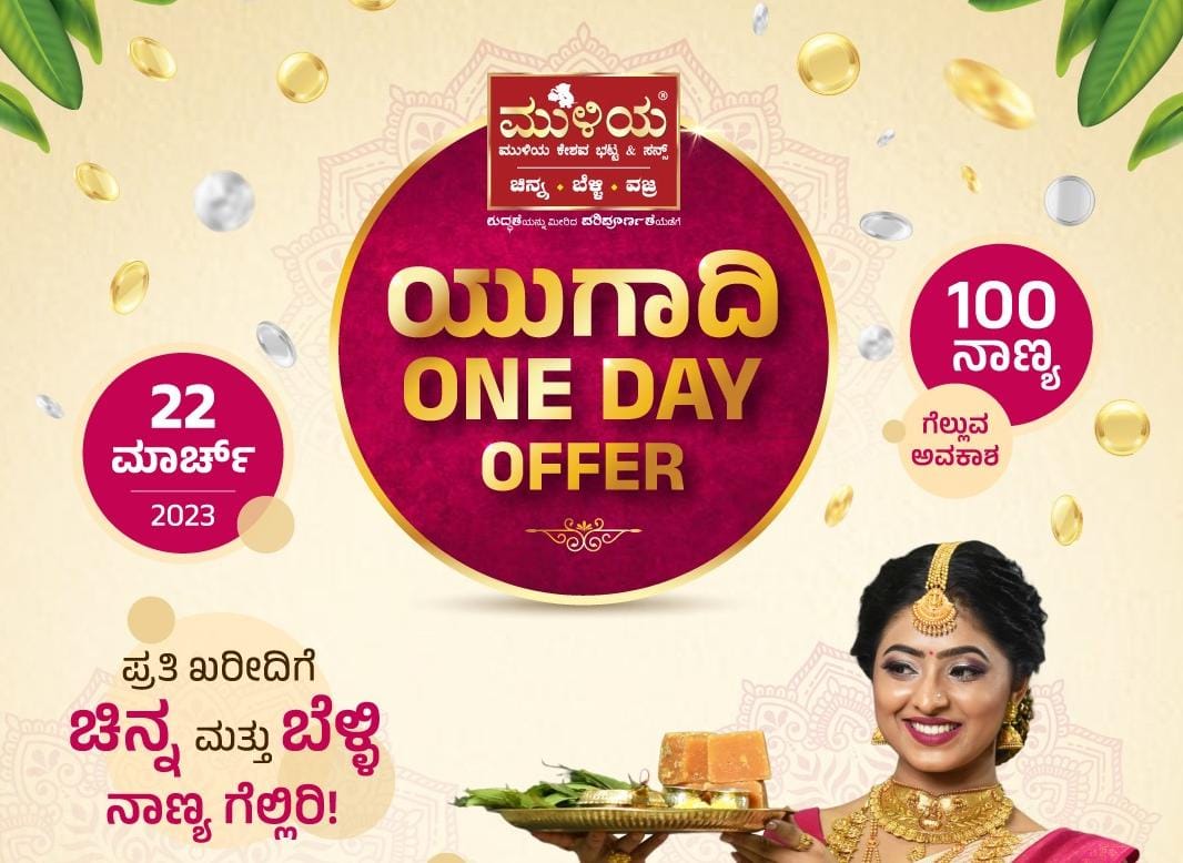 ಪುತ್ತೂರು: ರಾಜ್ಯದ ಹೆಸರಾಂತ ಚಿನ್ನಾಭರಣಗಳ ಮಳಿಗೆ ಮುಳಿಯ ಜ್ಯುವೆಲ್ಸ್ ಸಂಸ್ಥೆ ಯುಗಾದಿ ಹಬ್ಬದ ಪ್ರಯುಕ್ತ ತನ್ನ ಎಲ್ಲ ಶೋರೂಂಗಳಲ್ಲಿ ಮಾರ್ಚ್ 22ರಂದು ಯುಗಾದಿ ಒನ್ ಡೇ ವಿಶೇಷ ಆಫರ್ ನೀಡಲಾಗುತ್ತಿದೆ. ಪ್ರತಿ ಖರೀದಿಗೆ ಚಿನ್ನ ಮತ್ತು ಬೆಳ್ಳಿಯ ನಾಣ್ಯಗಳನ್ನು ಗೆಲ್ಲುವ ಸುವರ್ಣಾವಕಾಶವನ್ನು ಗ್ರಾಹಕರಿಗೆ ಒದಗಿಸಲಾಗುತ್ತಿದೆ ಎಂದು ಮುಳಿಯ ಜ್ಯುವೆಲ್ಸ್ ಸಂಸ್ಥೆಯ ಪ್ರಕಟಣೆ ತಿಳಿಸಿದೆ.