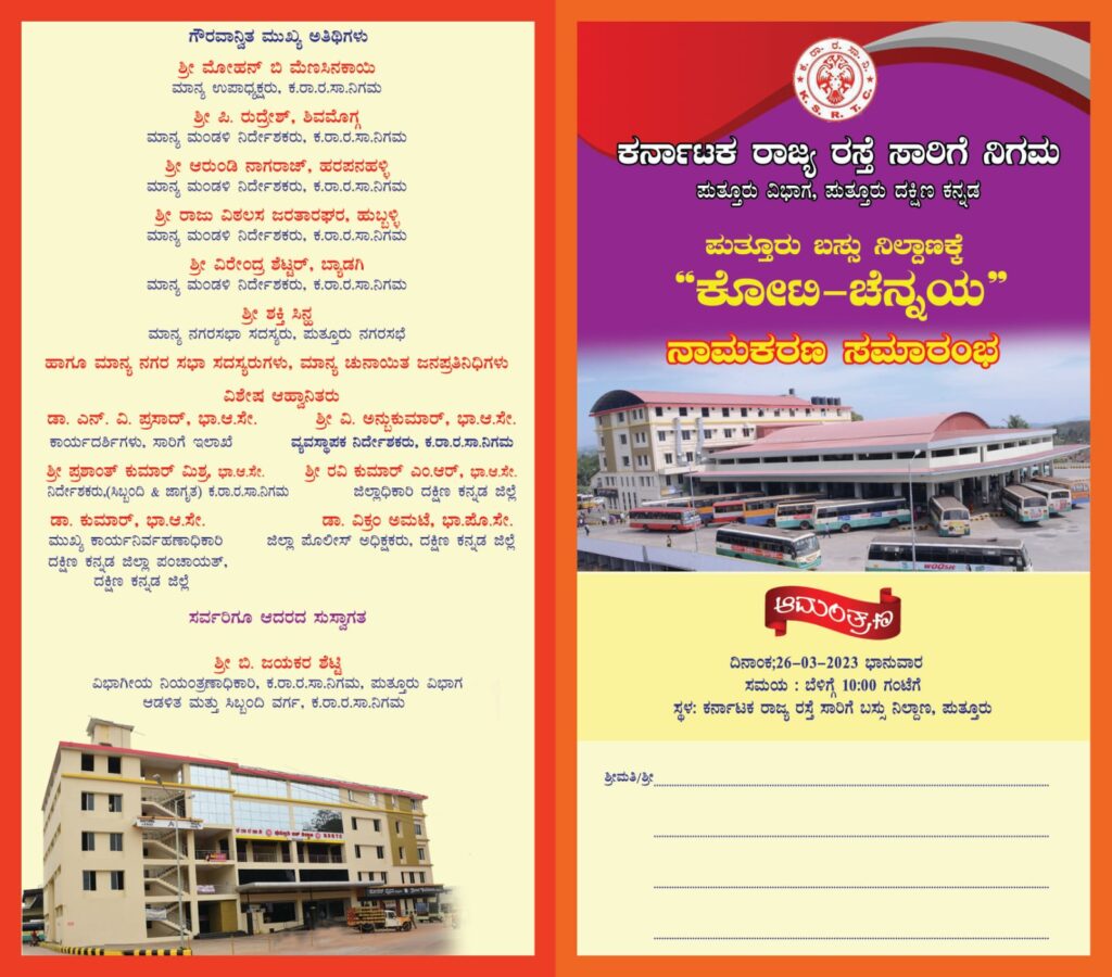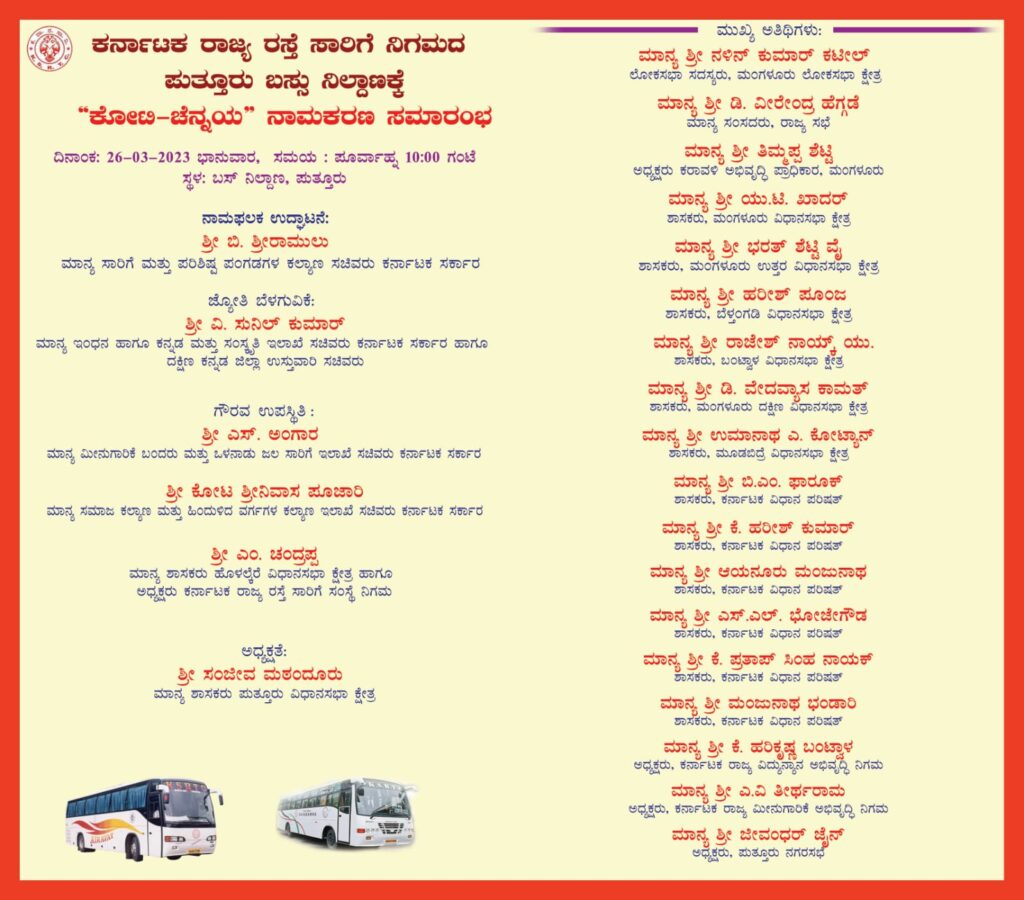 ಪುತ್ತೂರು: ಕರ್ನಾಟಕ ರಾಜ್ಯ ರಸ್ತೆ ಸಾರಿಗೆ ನಿಗಮದ ಪುತ್ತೂರು ಬಸ್ ನಿಲ್ದಾಣಕ್ಕೆ ಕೋಟಿ- ಚೆನ್ನಯ ಎಂಬ ನಾಮಕರಣ ಸಮಾರಂಭವು ಮಾ.26ರ ಭಾನುವಾರ ಬೆಳಗ್ಗೆ 10 ಗಂಟೆಗೆ ಪುತ್ತೂರಿನ ಬಸ್ ನಿಲ್ದಾಣದಲ್ಲಿ ಹಮ್ಮಿಕೊಳ್ಳಲಾಗಿದೆ.