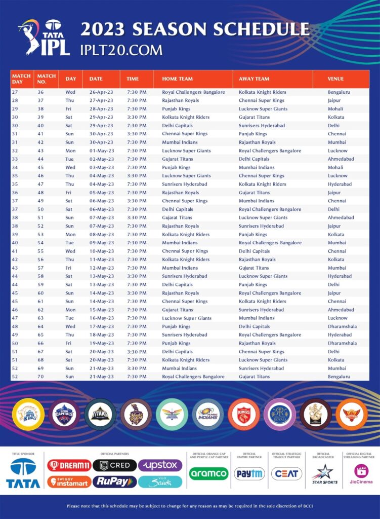 ಮೇ 23-26ರ ವರೆಗೆ ಪ್ಲೇ-ಆಫ್‌ ಪಂದ್ಯಗಳು ನಡೆಯಲಿದ್ದು, ಮೇ 28 ರಂದು ಅಹ್ಮದಾಬಾದ್‌ನ ನರೇಂದ್ರ ಮೋದಿ ಕ್ರೀಡಾಂಗಣದಲ್ಲಿ ಫೈನಲ್‌ ಪಂದ್ಯ ನಡೆಯಲಿದೆ.