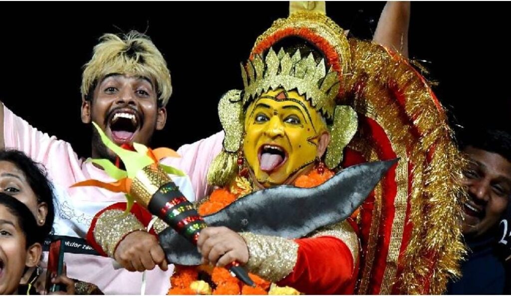 ‘ಕಾಂತಾರ’ ಪಂಜುರ್ಲಿ ದೈವದ ವೇಷ ಧರಿಸಿ ಆರ್.ಸಿ.ಬಿ ಪಂದ್ಯ ವೀಕ್ಷಿಸಿದ ಅಭಿಮಾನಿ : ಸಾಮಾಜಿಕ ಜಾಲತಾಣಗಳಲ್ಲಿ ವೈರಲ್ ; ಆಕ್ರೋಶ