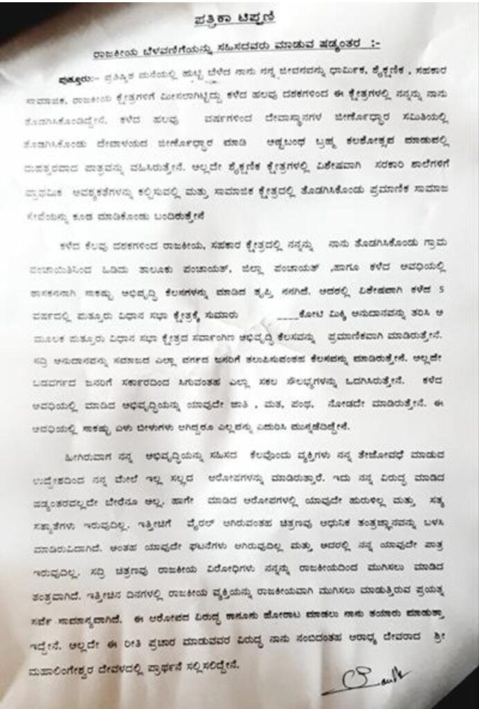 ಹೀಗಿರುವಾಗ ನನ್ನ ಅಭಿವೃದ್ಧಿಯನ್ನು ಸಹಿಸದ ಕೆಲವೊಂದು ವ್ಯಕ್ತಿಗಳು ನನ್ನ ತೇಜೋವಧೆ ಮಾಡುವ ಉದ್ದೇಶದಿಂದ ನನ್ನ ಮೇಲೆ ಇಲ್ಲ ಸಲ್ಲದ ಆರೋಪಗಳನ್ನು ಮಾಡಿರುತ್ತಾರೆ. ಇದು ನನ್ನ ವಿರುದ್ಧ ಮಾಡಿದ ಷಡ್ಯಂತರವಲ್ಲದೇ ಬೇರೆನೂ ಅಲ್ಲ. ಹಾಗೇ ಮಾಡಿದ ಆರೋಪಗಳಲ್ಲಿ ಯಾವುದೇ ಹುರುಳಿಲ್ಲ ಮತ್ತು ಸತ್ಯ ಸತ್ಯಾತೆಗಳು ಇರುವುದಿಲ್ಲ, ಇತ್ತೀಚಿಗೆ ವೈರಲ್ ಆಗಿರುವಂತಹ ಚಿತ್ರಣವು ಆಧುನಿಕ ತಂತ್ರಜ್ಞಾನವನ್ನು ಬಳಸಿ ಮಾಡಿರುವುದಾಗಿದೆ. ಅಂತಹ ಯಾವುದೇ ಘಟನೆಗಳು ಆಗಿರುವುದಿಲ್ಲ ಮತ್ತು ಅದರಲ್ಲಿ ನನ್ನ ಯಾವುದೇ ಪಾತ್ರ ಇರುವುದಿಲ್ಲ. ಸದ್ರಿ ಚಿತ್ರಣವು ರಾಜಕೀಯ ವಿರೋಧಿಗಳು ನನ್ನನ್ನು ರಾಜಕೀಯದಿಂದ ಮುಗಿಸಲು ಮಾಡಿದ ತಂತ್ರವಾಗಿದೆ.