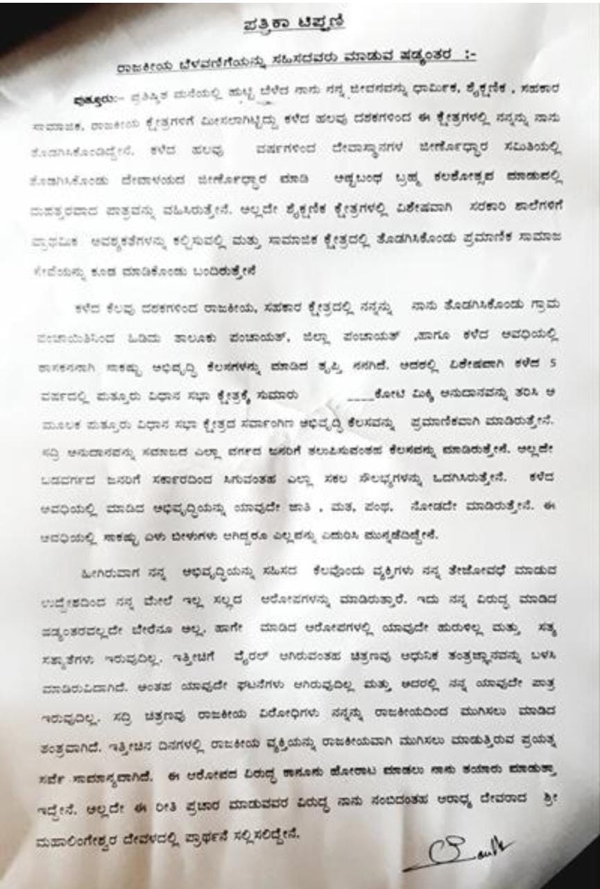 ಇತ್ತೀಚಿನ ದಿನಗಳಲ್ಲಿ ರಾಜಕೀಯ ವ್ಯಕ್ತಿಯನ್ನು ರಾಜಕೀಯವಾಗಿ ಮುಗಿಸಲು ಮಾಡುತ್ತಿರುವ ಪ್ರಯತ್ನ ಸರ್ವೇ ಸಾಮಾನ್ಯವಾಗಿದೆ. ಈ ಆರೋಪದ ವಿರುದ್ಧ ಕಾನೂನು ಹೋರಾಟ ಮಾಡಲು ನಾನು ತಯಾರು ಮಾಡುತ್ತಾ ಇದ್ದೇನೆ. ಅಲ್ಲದೇ ಈ ರೀತಿ ಪ್ರಚಾರ ಮಾಡುವವರ ವಿರುದ್ಧ ನಾನು ನಂಬಿದಂತಹ ಆರಾಧ್ಯ ದೇವರಾದ ಶ್ರೀ ಮಹಾಲಿಂಗೇಶ್ವರ ದೇವಳದಲ್ಲಿ ಪ್ರಾರ್ಥನೆ ಸಲ್ಲಿಸಲಿದ್ದೇನೆ ಎಂದು ಅವರು ಸ್ಪಷ್ಟನೆ ನೀಡಿದ್ದಾರೆ.