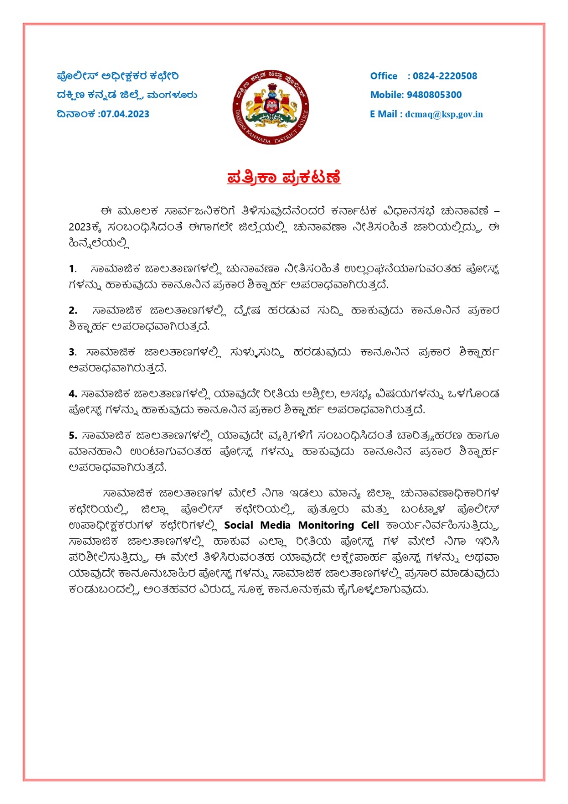 ಸಾಮಾಜಿಕ ಜಾಲತಾಣಗಳ ಮೇಲೆ ನಿಗಾ ಇಡಲು ಜಿಲ್ಲಾ ಚುನಾವಣಾಧಿಕಾರಿಗಳ ಕಛೇರಿಯಲ್ಲಿ ಜಿಲ್ಲಾ ಪೊಲೀಸ್ ಕಛೇರಿಯಲ್ಲಿ, ಪುತ್ತೂರು ಮತ್ತು ಬಂಟ್ವಾಳ ಪೊಲೀಸ್ ಉಪಾಧೀಕ್ಷಕರುಗಳ ಕಛೇರಿಗಳಲ್ಲಿ Social Media Monitoring Cell ಕಾರ್ಯನಿರ್ವಹಿಸುತ್ತಿದ್ದು, ಸಾಮಾಜಿಕ ಜಾಲತಾಣಗಳಲ್ಲಿ ಹಾಕುವ ಎಲ್ಲಾ ರೀತಿಯ ಪೋಸ್ಟ್ ಗಳ ಮೇಲೆ ನಿಗಾ ಇರಿಸಿ ಪರಿಶೀಲಿಸುತ್ತಿದ್ದು, ಈ ಮೇಲೆ ತಿಳಿಸಿರುವಂತಹ ಯಾವುದೇ ಅಕ್ಷೇಪಾರ್ಹ ಪೋಸ್ಟ್ ಗಳನ್ನು ಅಥವಾ ಯಾವುದೇ ಕಾನೂನುಬಾಹಿರ ಪೋಸ್ಟ್ ಗಳನ್ನು ಸಾಮಾಜಿಕ ಜಾಲತಾಣಗಳಲ್ಲಿ ಪ್ರಸಾರ ಮಾಡುವುದು ಕಂಡುಬಂದಲ್ಲಿ, ಅಂತವರ ವಿರುದ್ಧ ಸೂಕ್ತ ಕಾನೂನುಕ್ರಮ ಕೈಗೊಳ್ಳಲಾಗುವುದು ಎಂದು ತಿಳಿಸಿದ್ದಾರೆ.