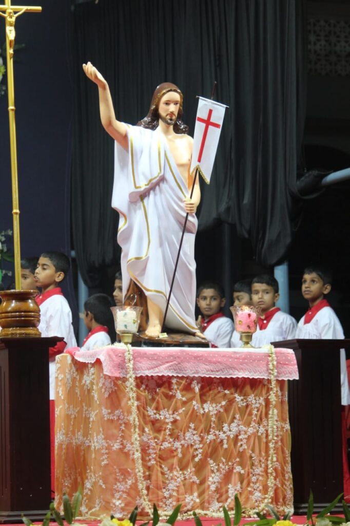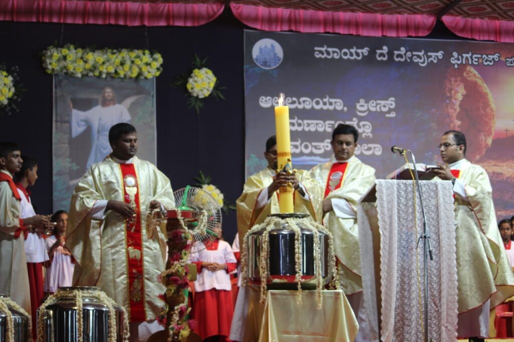 ಚರ್ಚ್ ವಠಾರದ ಎಲ್ಲಾ ವಿದ್ಯುತ್ ಬೆಳಕನ್ನು ನಂದಿಸಿ ನಂತರ ಒಂದು ದೊಡ್ಡ ಮೇಣದ ಬತ್ತಿಗೆ ಯೇಸುವನ್ನು ಶಿಲುಬೆಗೆ ಏರಿಸಿದಾಗ ಹೊಡೆದಿರುವoತಹ ಮೊಳೆಗಳನ್ನು ಚುಚ್ಚಲಾಗುತ್ತದೆ. ತದನಂತರ ಆಶೀರ್ವದಿಸಿದ ಹೊಸ ಬೆಂಕಿಯಿಂದ ಮೇಣದ ಬತ್ತಿಯನ್ನು ಹೊತ್ತಿಸಲಾಗುತ್ತದೆ. ಈ ಮೇಣದ ಬತ್ತಿಯನ್ನು ಹಿಡಿದ ಯಾಜಕರು ಜನರ ನಡುವಿನಿಂದ ಹೋಗುವಾಗ ಇದು ಯೇಸಕ್ರಿಸ್ತರ ಜ್ಯೋತಿಯು ಎಂದು ಉದ್ಗರಿಸಿದಾಗ ಎಲ್ಲಾ ಭಕ್ತಾದಿಗಳು ದೇವರಿಗೆ ಮಹಿಮೆ ಸಲ್ಲಲ್ಲಿ ಎಂದು ಜೈಕಾರವನ್ನು ಕೂಗುತ್ತಾ ಆ ಜ್ಯೋತಿಯಿಂದ ತಮ್ಮಲ್ಲಿ ಇರುವ ಮೇಣದ ಬತ್ತಿಯನ್ನು ಹೊತ್ತಿಸುತ್ತಾರೆ. ಧಾರ್ಮಿಕ ವಿಧಿವಿಧಾನಗಳು ಬೈಬಲ್ ನ ಹಳೆ ಒಡoಬಡಿಕೆಯ ಮೂರು ವಚನಗಳು ಸ್ತುತಿ ಗೀತೆಗಳು ಆದನಂತರ ಪುನರುತ್ಥಾನ ಯೇಸುವಿನ ಪ್ರತಿಮೆಯು ಆನವರಣಗೊಳಿಸಲಾಯಿತು.
