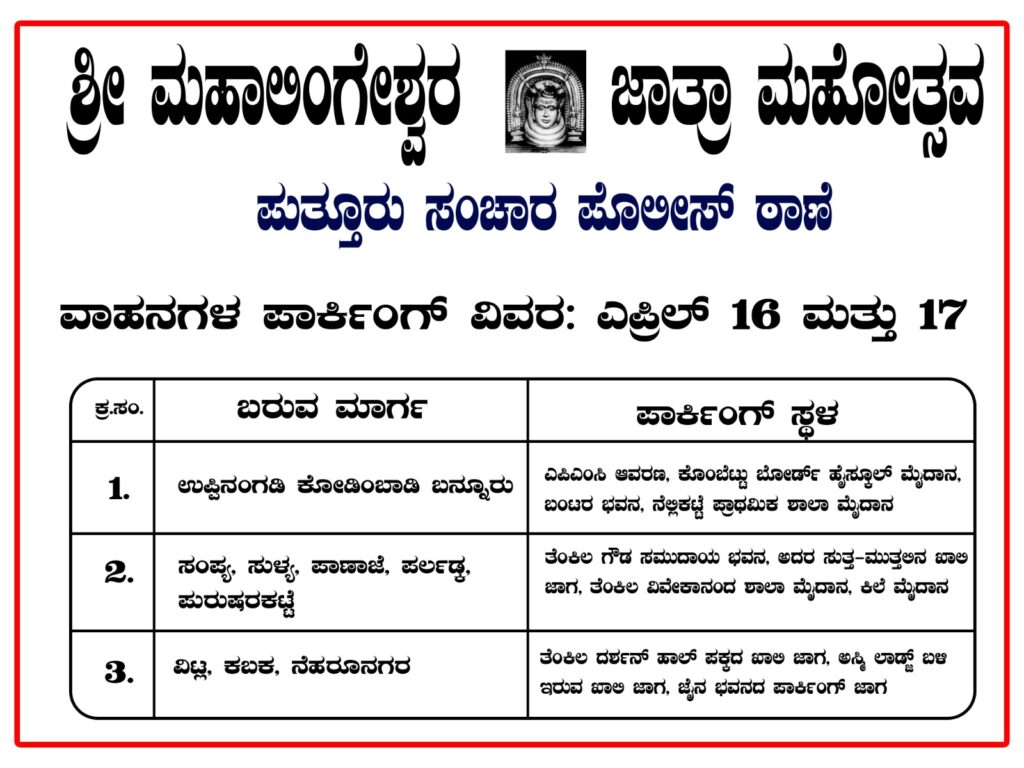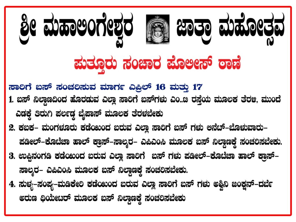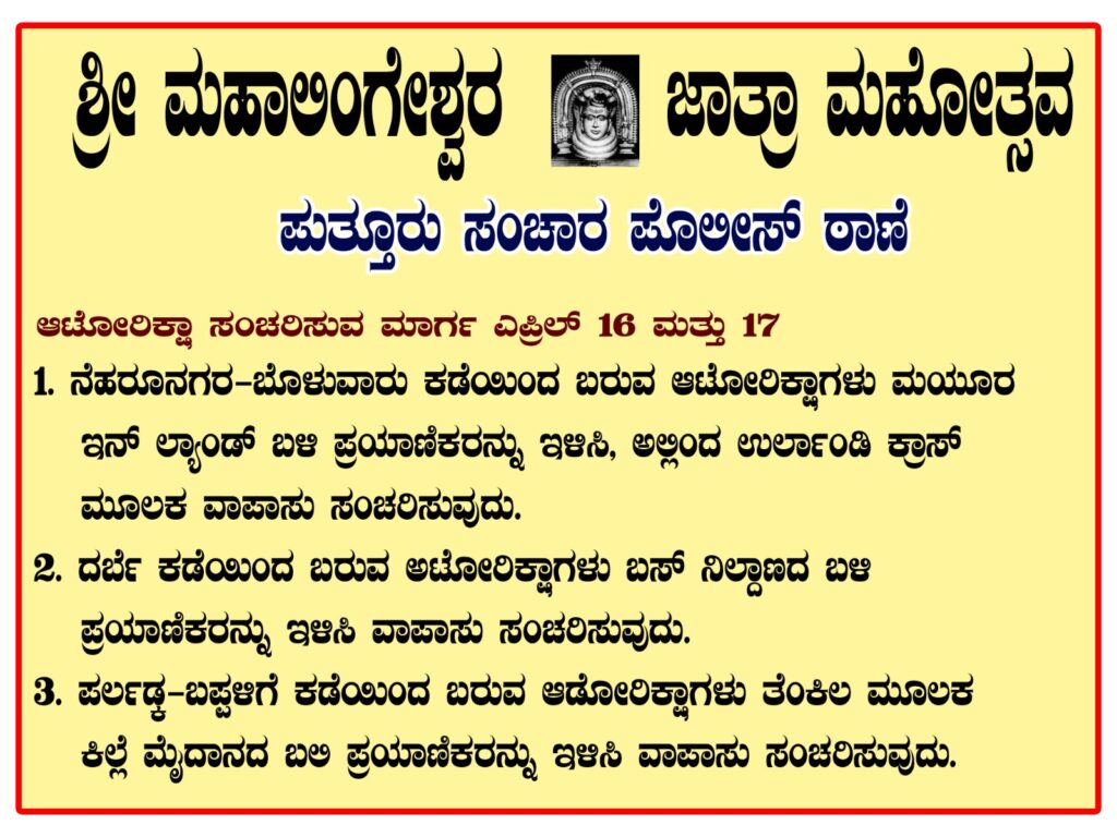 ಪುತ್ತೂರು: ಶ್ರೀ ಮಹಾಲಿಂಗೇಶ್ವರ ದೇವಸ್ಥಾನದ ಜಾತ್ರೋತ್ಸವಕ್ಕೆ ಆಗಮಿಸುವ ಭಕ್ತಾದಿಗಳಿಗೆ ಸುಗಮ ಸಂಚಾರಕ್ಕೆ ಅವಕಾಶ ಮಾಡಿಕೊಡುವ ನಿಟ್ಟಿನಲ್ಲಿ ಎ.16 ಮತ್ತು 17 ರಂದು ಪುತ್ತೂರು ನಗರದ ಪ್ರಮುಖ ರಸ್ತೆಗಳಲ್ಲಿ ವಾಹನ ಸಂಚಾರದಲ್ಲಿ ತಾತ್ಕಾಲಿಕವಾಗಿ ಬದಲಾವಣೆ ಮಾಡಲಾಗಿದೆ.