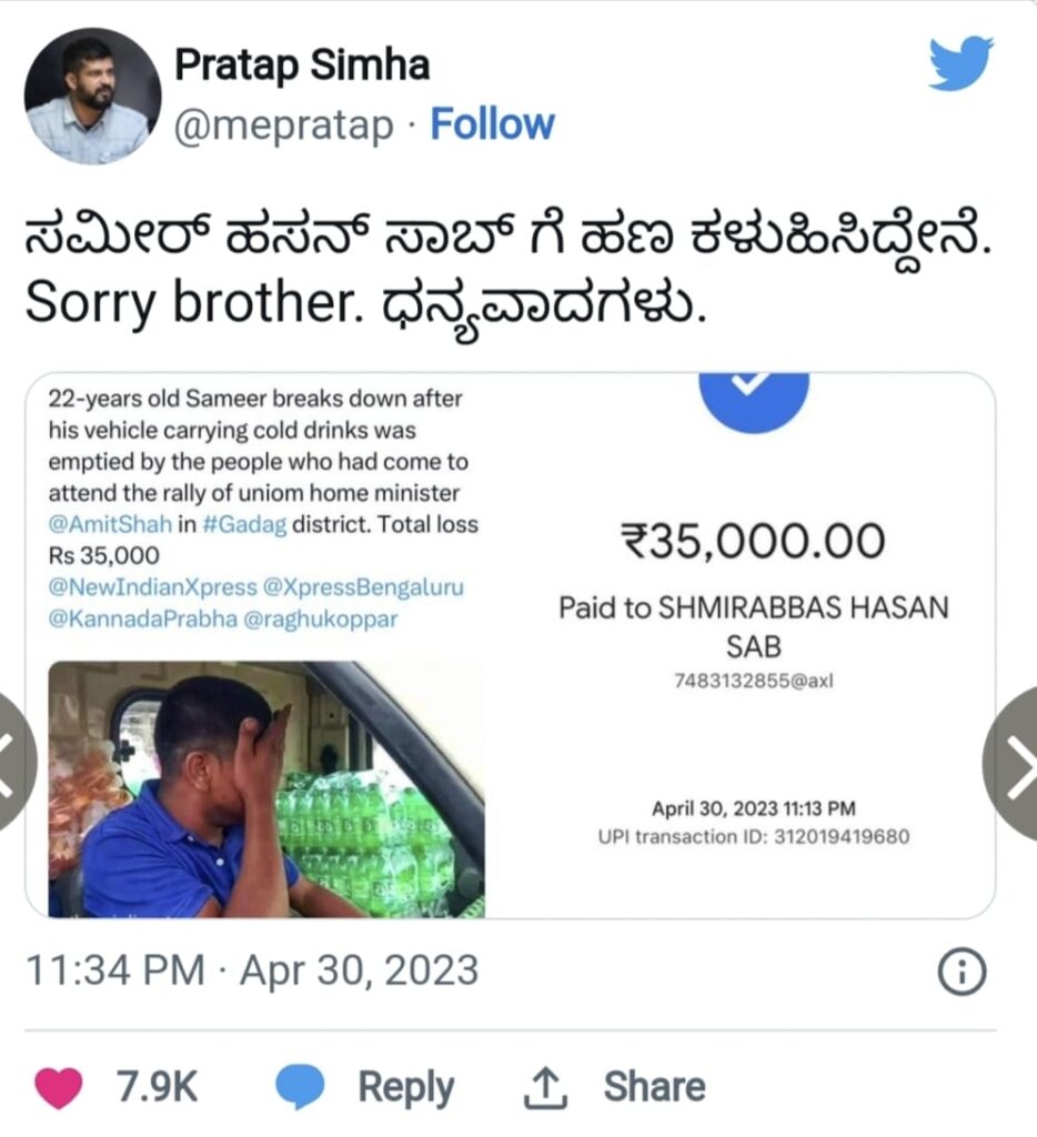 ಹಣ ಕೊಡದೆ ಕೂಲ್​ ಡ್ರಿಂಕ್ಸ್​ ಹೊತ್ತೊಯ್ದರಿಂದ ಸಮೀರ್​ಗೆ ನಷ್ಟವಾಗಿದೆ. ನಷ್ಟದಿಂದ ಆತ ಕಣ್ಣೀರು ಹಾಕಿದ್ದಾನೆ. ಈ ವಿಚಾರ ತಿಳಿದು ಬಂದಂತೆ ಮೈಸೂರು ಸಂಸದ ಪ್ರತಾಪ್ ಸಿಂಹ ಮಾನವೀಯತೆ ಮೆರೆದಿದ್ದಾರೆ. ನಷ್ಟ ಅನುಭವಿಸಿದ ಸಮೀರ್​ಗೆ ಹಣವನ್ನು ಕಳುಹಿಸಿದ್ದಾರೆ. ಮಾತ್ರವಲ್ಲದೆ ಈ ಸಂಗತಿಯನ್ನು ತಮ್ಮ ಟ್ವಿಟರ್​ ಖಾತೆಯಲ್ಲೂ ಹಂಚಿಕೊಂಡಿದ್ದಾರೆ.