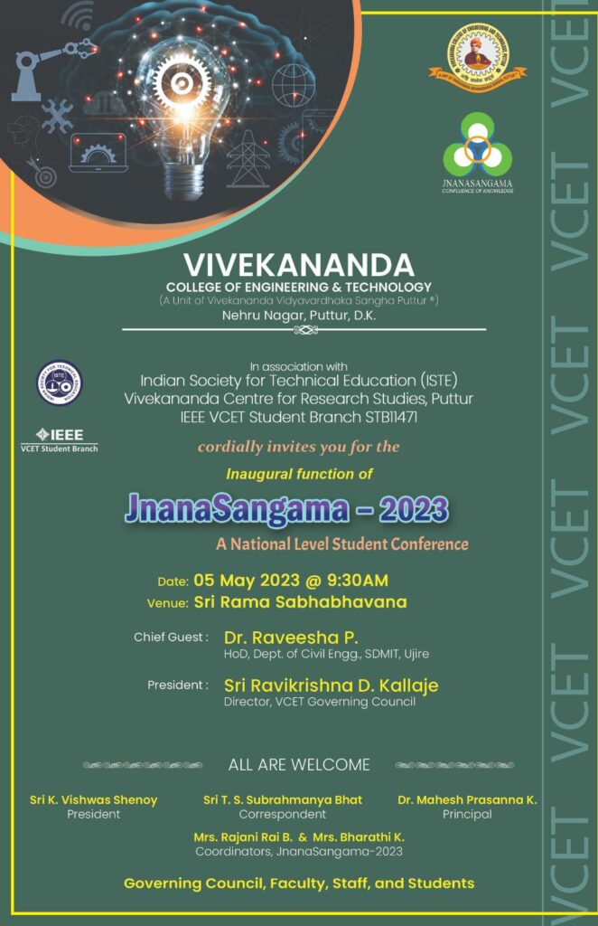 ಪುತ್ತೂರು : ವಿವೇಕಾನಂದ ಕಾಲೇಜ್ ಆಫ್ ಇಂಜಿನಿಯರಿಂಗ್ ಎಂಡ್ ಟೆಕ್ನಾಲಜಿ ಪುತ್ತೂರು, ಭಾರತೀಯ ತಾಂತ್ರಿಕ ಶಿಕ್ಷಣ ಸಂಘ ನವದೆಹಲಿ, ವಿವೇಕಾನಂದ ಸಂಶೋಧನಾ ಕೇಂದ್ರ ಪುತ್ತೂರು ಮತ್ತು ಐಇಇಇ ವಿಸಿಇಟಿ ವಿದ್ಯಾರ್ಥಿ ವಿಭಾಗ ಇದರ ಸಂಯುಕ್ತ ಆಶ್ರಯದಲ್ಲಿ ರಾಷ್ಟ್ರೀಯ ಮಟ್ಟದ ವಿದ್ಯಾರ್ಥಿ ಕಾರ್ಯಾಗಾರ ಜ್ಞಾನ ಸಂಗಮ-2023ನ್ನು ಮೇ.5 ಶುಕ್ರವಾರ ಕಾಲೇಜಿನ ಶ್ರೀರಾಮ ಸಭಾಭವನದಲ್ಲಿ ಆಯೋಜಿಸಲಾಗಿದೆ.
