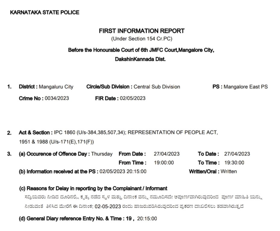 ಈ ಬಗ್ಗೆ ಐಪಿಸಿ 1860 (U/s-384,385,507,34); REPRESENTATION OF PEOPLE ACT,1951 & 1988 (U/s-171(E),171(F) ರಂತೆ ಪ್ರಕರಣ ದಾಖಲಾಗಿದೆ.