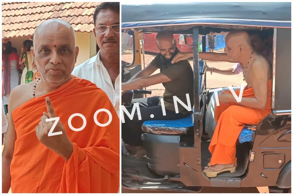 ಆಟೋ ರಿಕ್ಷಾದಲ್ಲಿ ಮತಗಟ್ಟೆಗೆ ಆಗಮಿಸಿದ ಸ್ವಾಮೀಜಿ ಸರತಿಸಾಲಿನಲ್ಲಿ ನಿಂತು ಮತಚಲಾವಣೆ ಮಾಡಿದರು.