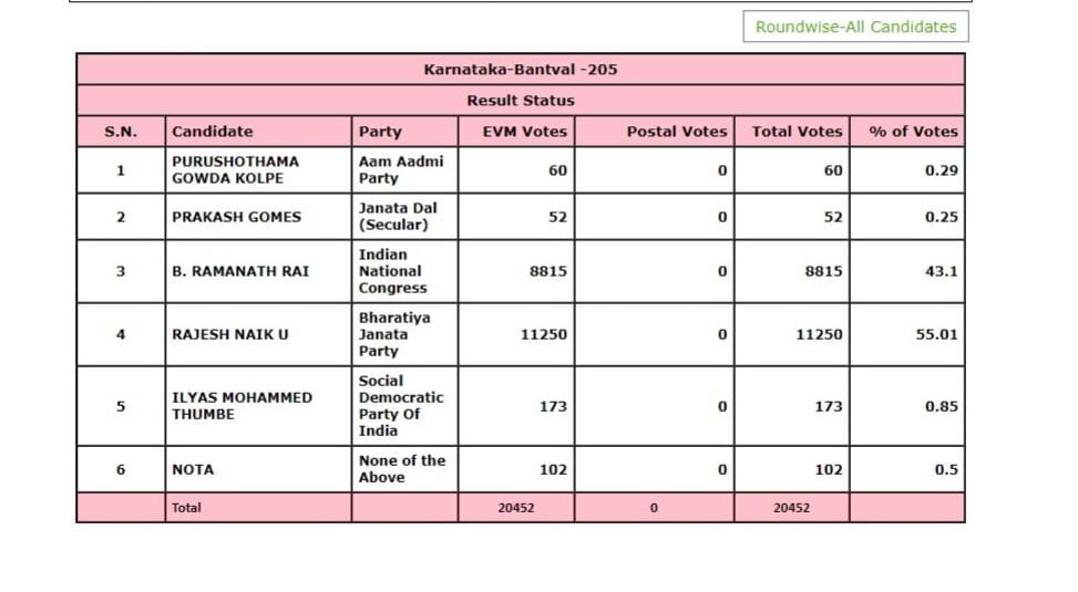 ಬಿಜೆಪಿ ಅಭ್ಯರ್ಥಿ ರಾಜೇಶ್ ನಾಯ್ಕ್ ಮುನ್ನಡೆ ಪಡೆದಿದ್ದಾರೆ.