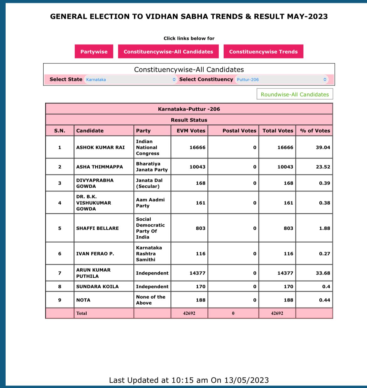 ಅಶೋಕ್ ರೈ -16,666, ಮತಗಳು