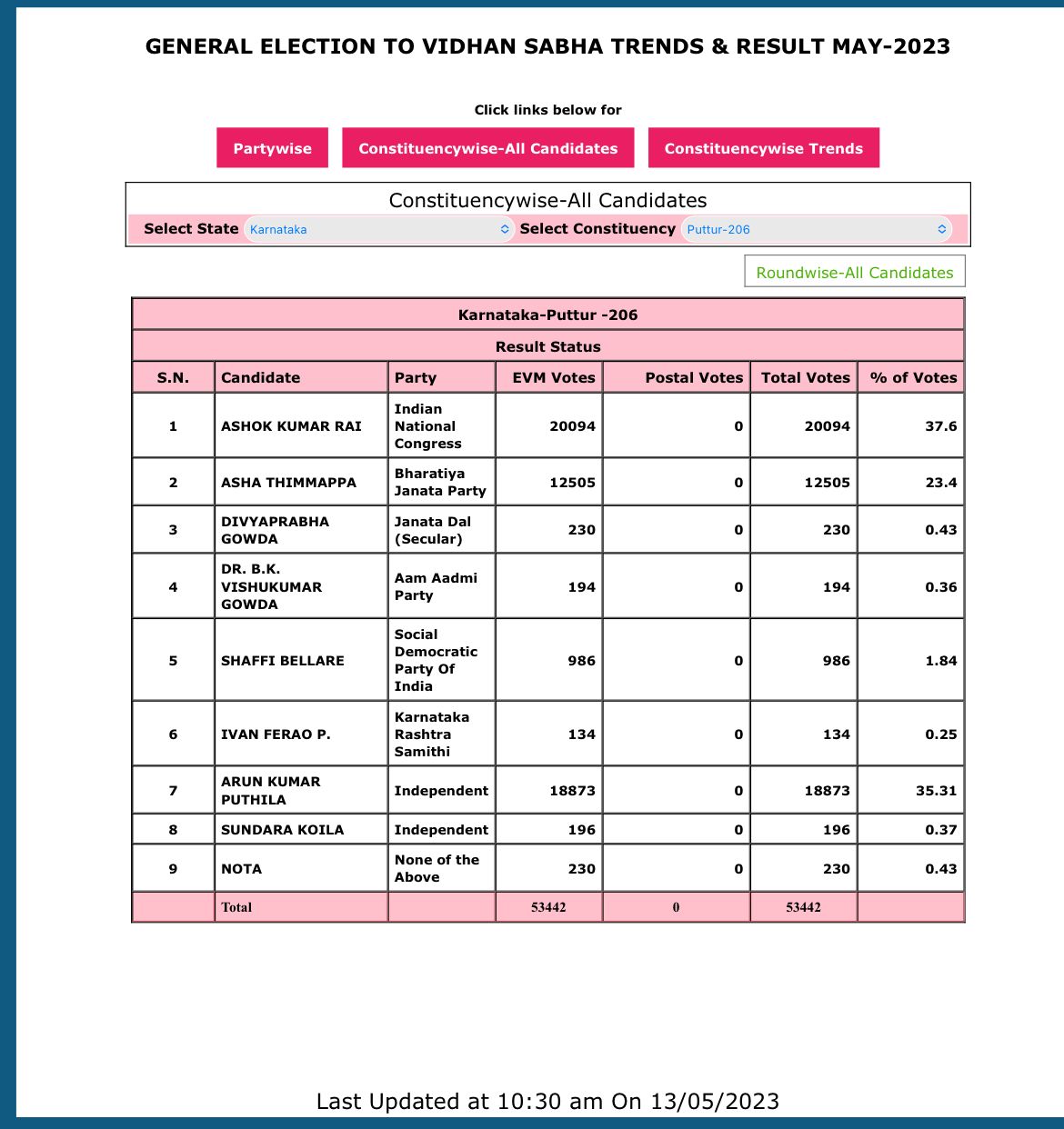 ವಿಧಾನ ಸಭಾ ಚುನಾವಣೆ 2023 : ಕಾಂಗ್ರೆಸ್ ಅಭ್ಯರ್ಥಿ ಅಶೋಕ್ ರೈ ಗೆ – 20,094 ಅರುಣ್ ಪುತ್ತಿಲರಿಗೆ – 18,873