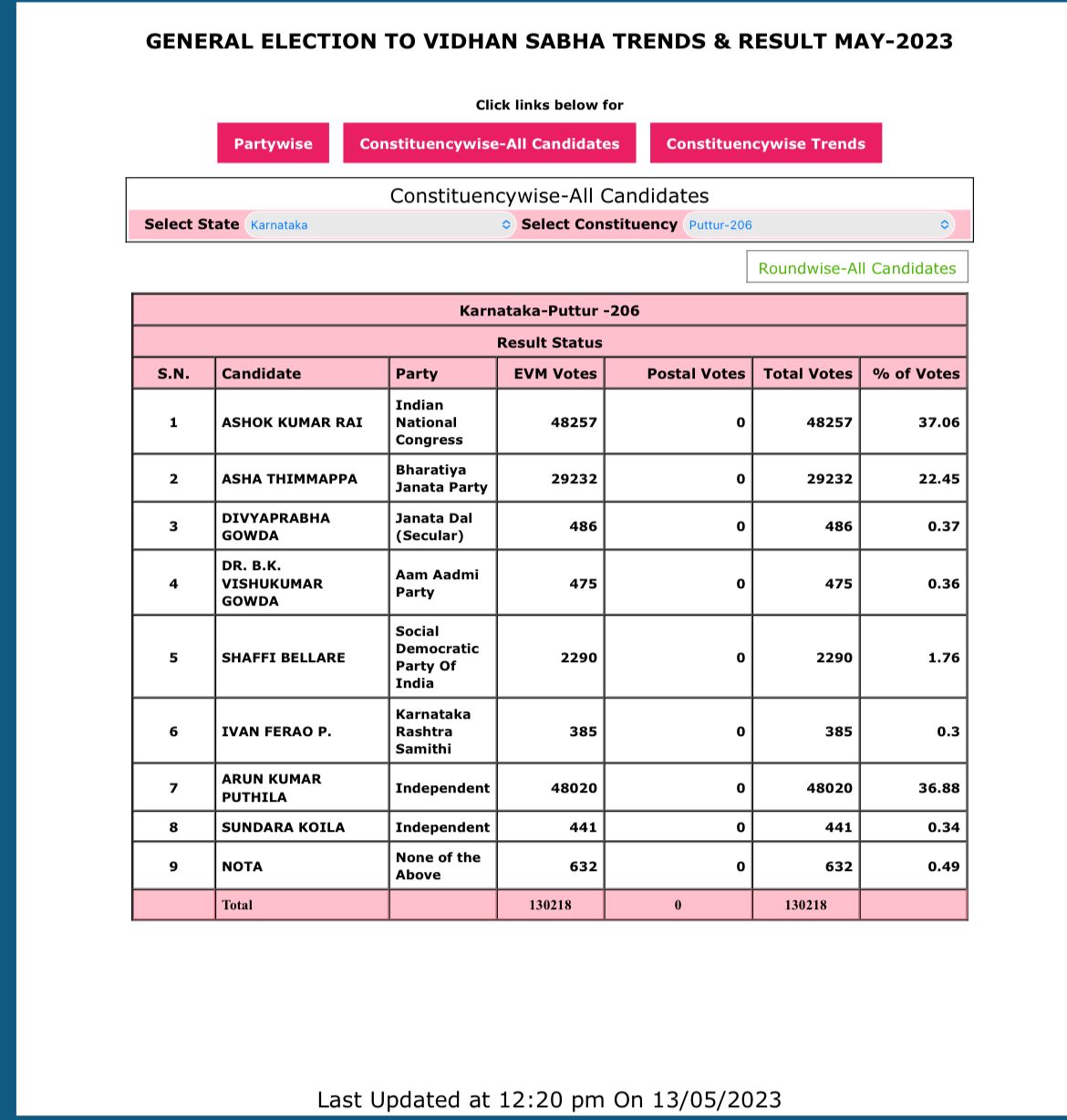 ದಕ್ಷಿಣ ಕನ್ನಡ : ಪುತ್ತೂರಿನಲ್ಲಿ ಕಾಂಗ್ರೆಸ್ ಅಭ್ಯರ್ಥಿ ಅಶೋಕ್ ರೈ – 48,257 ಪಕ್ಷೇತರ ಅಭ್ಯರ್ಥಿ ಅರುಣ್ ಪುತ್ತಿಲ – 43,896 ಮತ ಪಡೆದಿದ್ದಾರೆ.